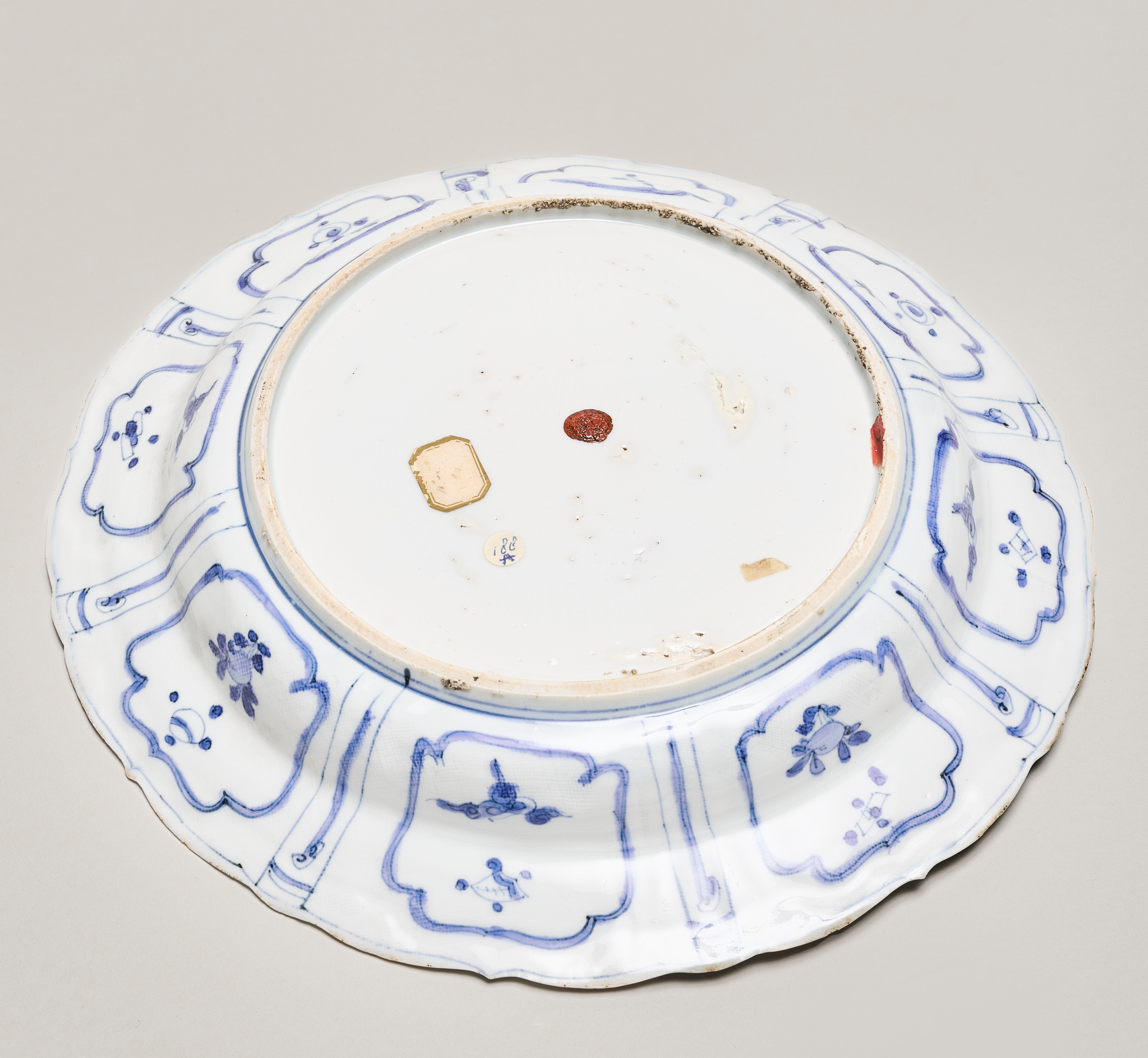 A finely potted and moulded plate, with shallow spreading sides and a wide foliate rim. Painted in the distinctive Kraak style, the decoration has outlines in an intense cobalt blue, with infill in paler hues. The cavetto has a finely painted scene of a scholar reading a scroll, in a garden with overhanging rocks. He is dressed in flowing robes and is seated next to a table with scholar’s accoutrements. The central scene is surrounded by a band of dense blue diaper. The sides and rim is divided into eight panels within blue foliate borders, decorated alternately with flowering plants and birds with fruit. In between are narrower panels with a diaper pattern and beaded pendants. The outside of the rim has loosely painted blue bordered foliate panels sparing decorated with a spray of fruit and one of the hundred treasures, interspersed with narrow panels with an elongated lingzhi fungus. The footring and bottom has some kiln grit which has adhered to the surface; the underside is undecorated and glazed. The bottom has a red lacquer seal impressed with an unidentified European family crest, an older inventory label with a black edge and a small round label (nr. 188a) from the Nieuwenhuys Collection.