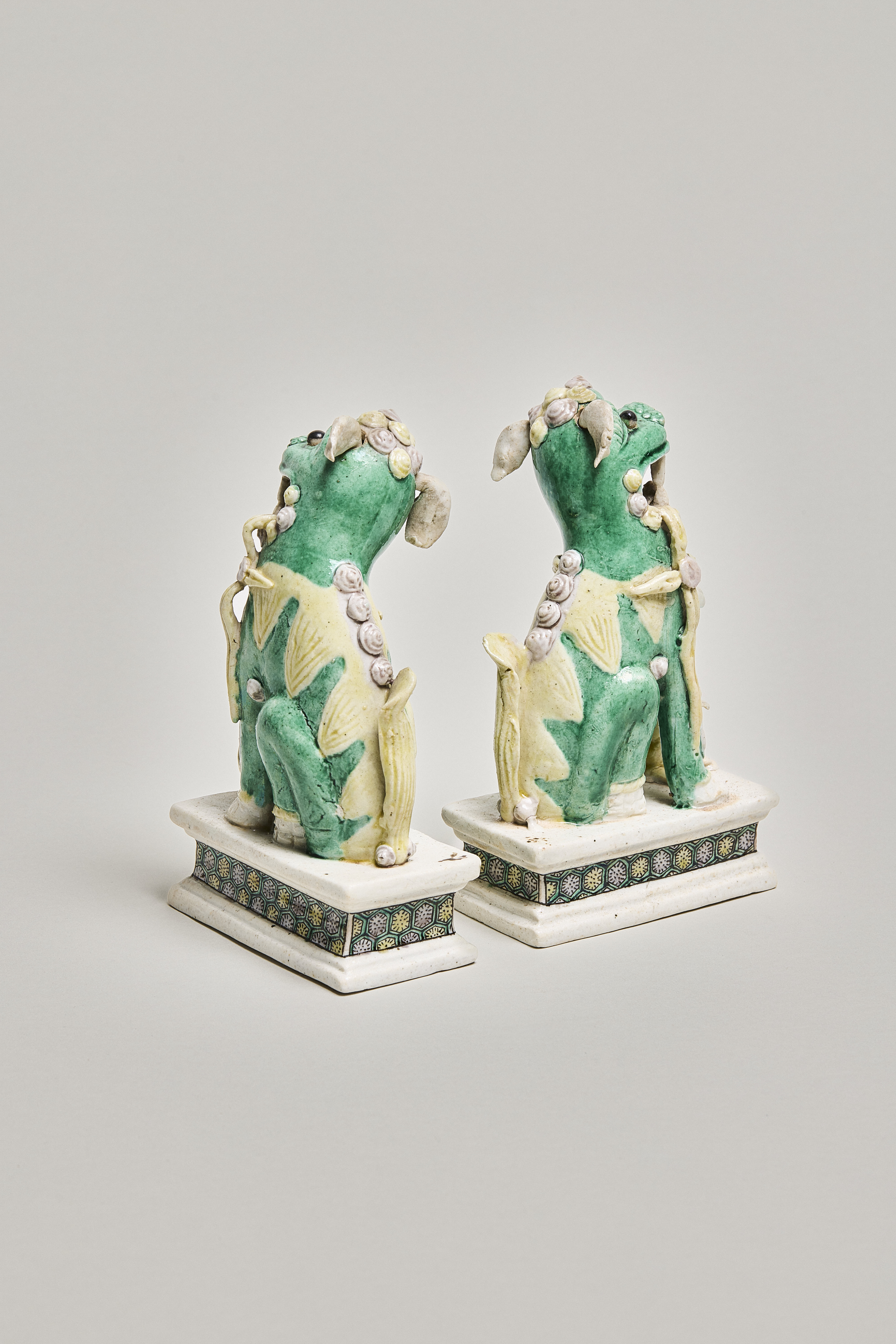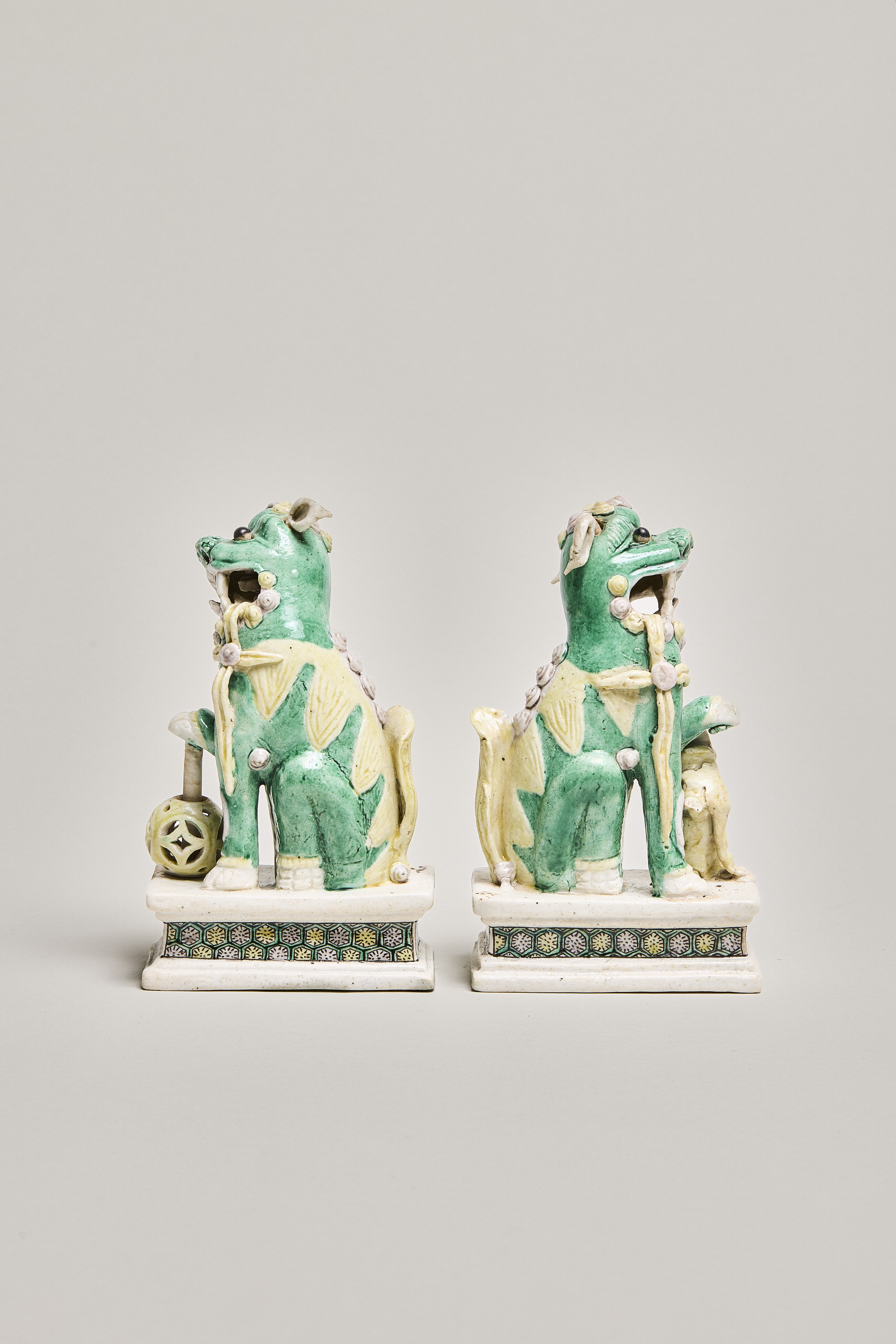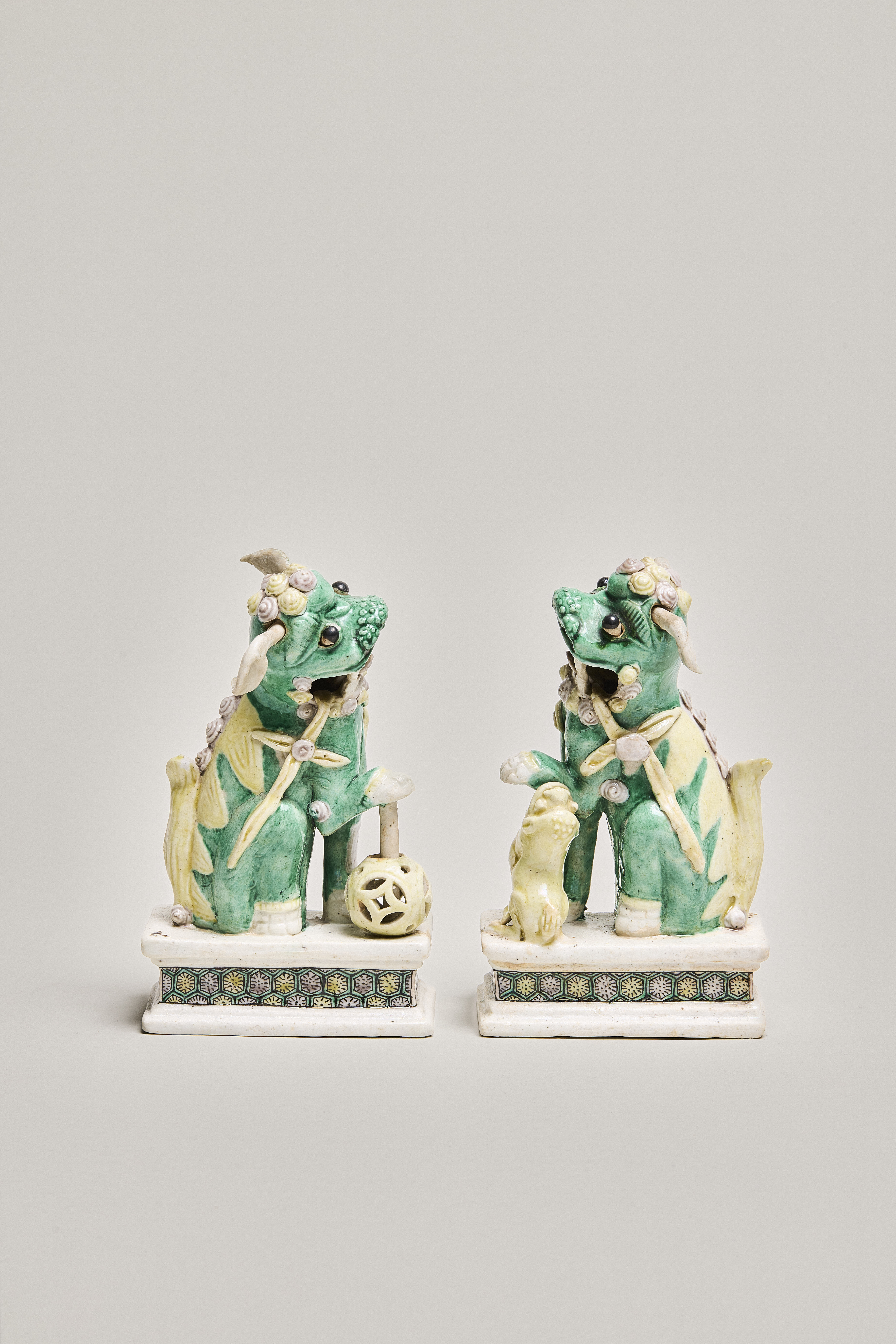 A pair of enamel on biscuit figurines of Buddhist lions (shizi 獅子), standing on low rectangular plinths. Their bodies are glazed with tri-coloured sancai enamels in green, yellow and aubergine. Their body is green, with the mane and tail in a contrasting yellow. Both lions have their mouths open, teeth bared with yellow pennant ribbons flowing from the corners of their mouths. They have their original articulated white pointed ears and protruding black eyeballs. Stylized yellow and aubergine curls decorate the top of their head, with four additional aubergine curls on their backs. The teeth, paws and ears are left unenamelled and covered with a thin transparent glaze. The female lion looks left, a lion cub jumping up her left leg. The male looks to the right, his right paw resting on a pole with a yellow moveable openwork ball.