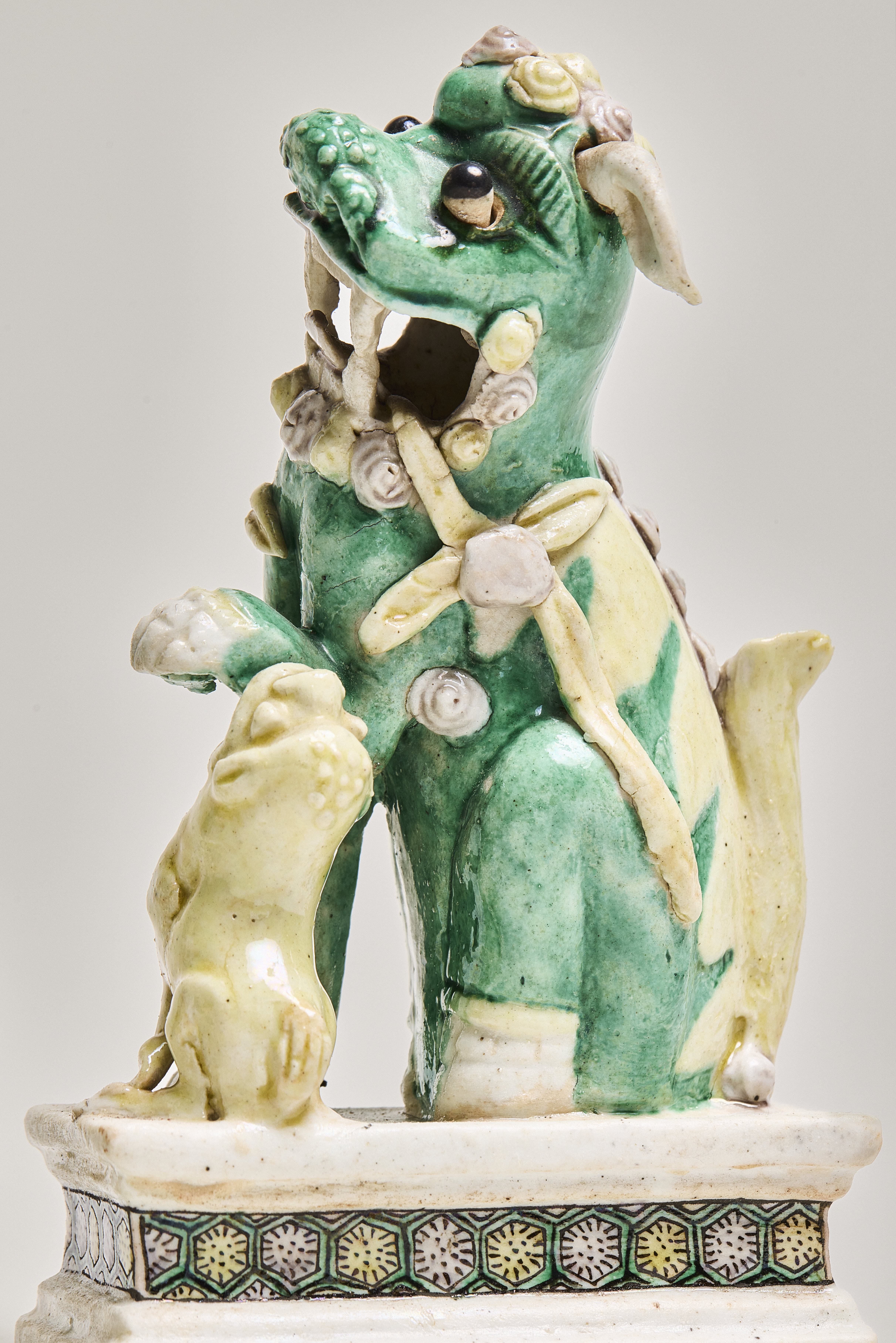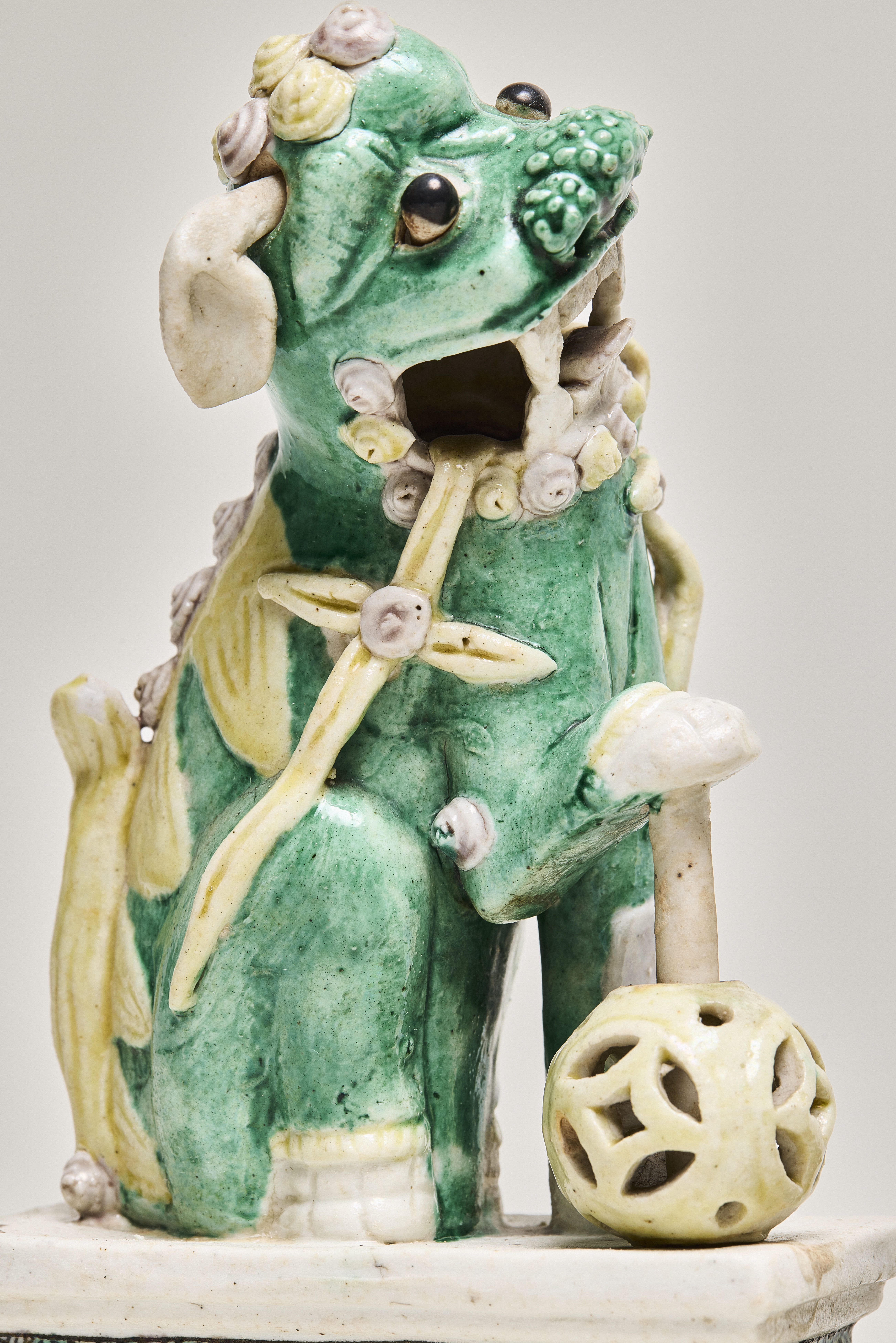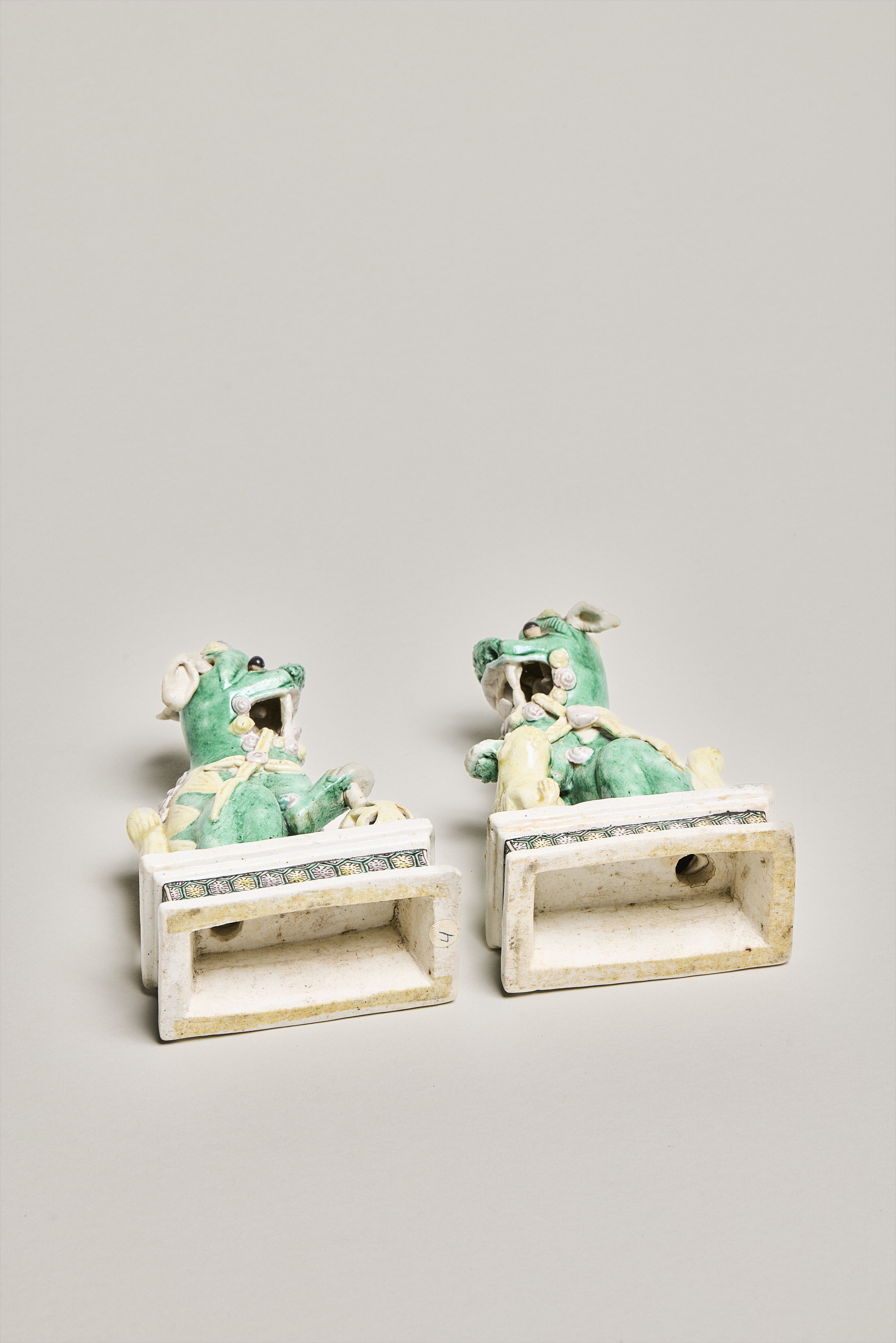 A pair of enamel on biscuit figurines of Buddhist lions (shizi 獅子), standing on low rectangular plinths. Their bodies are glazed with tri-coloured sancai enamels in green, yellow and aubergine. Their body is green, with the mane and tail in a contrasting yellow. Both lions have their mouths open, teeth bared with yellow pennant ribbons flowing from the corners of their mouths. They have their original articulated white pointed ears and protruding black eyeballs. Stylized yellow and aubergine curls decorate the top of their head, with four additional aubergine curls on their backs. The teeth, paws and ears are left unenamelled and covered with a thin transparent glaze. The female lion looks left, a lion cub jumping up her left leg. The male looks to the right, his right paw resting on a pole with a yellow moveable openwork ball.