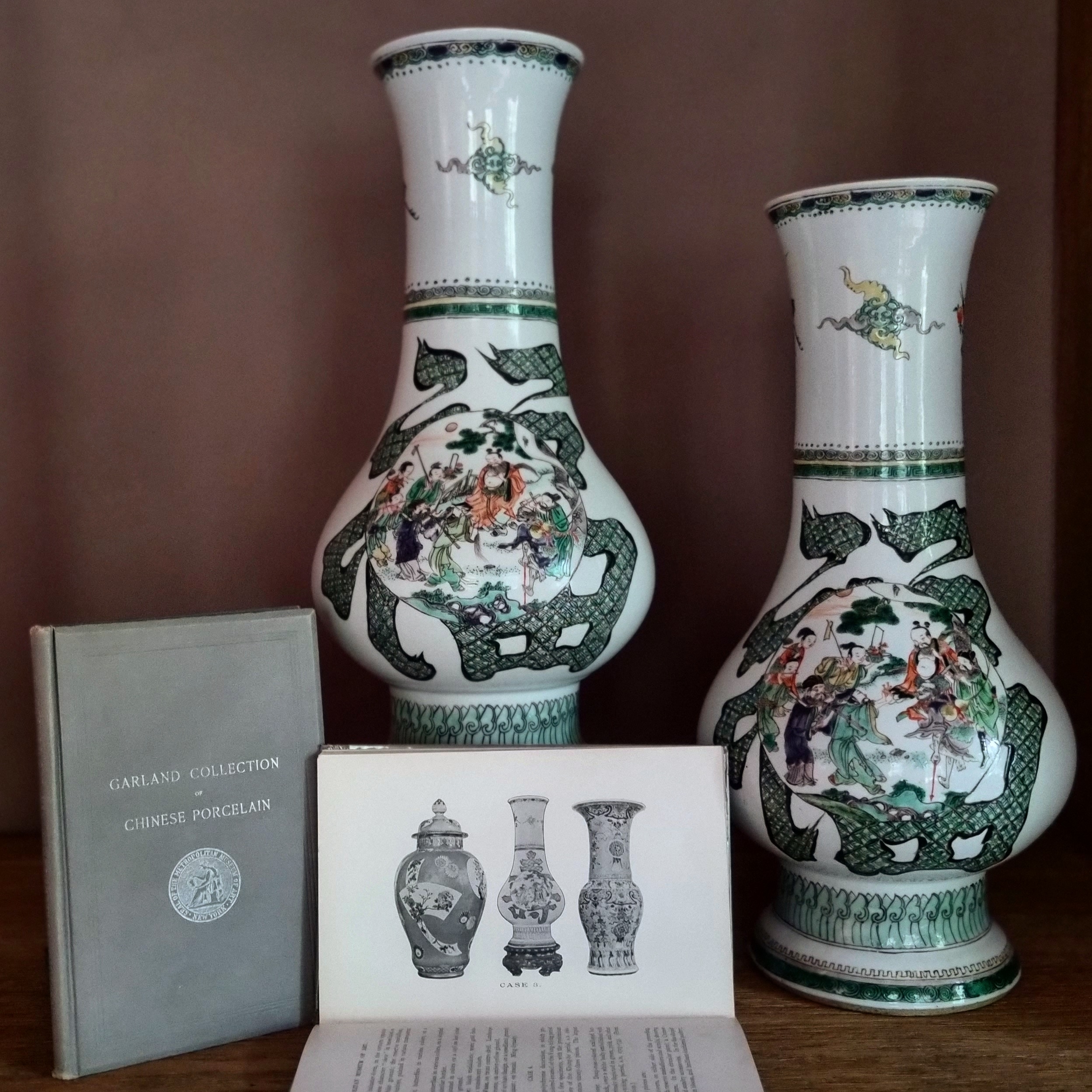 A pair of unusual pear-shaped vases with famille verte enamels on a white ground, handsomely decorated with highly auspicious figures and symbols. The bulbous body stands on a high foot , the tall neck gently flaring out to a wide mouth. On both sides is a large Chinese character for Shou and Fu, filled with a diaper pattern and outlined in black. It is overlaid with a large circular reserve medallion with Daoist figures. The everted mouth has a band of lingzhi fungus alternating in yellow, aubergine and green, with a row of black dots below. The neck is decorated with two flying cranes holding a branch with a peach, alternating with a clouds clusters; clouds being the symbol of the celestial realms and the cranes emblems of longevity. The lower neck has another four adjoined ornamental bands in green, yellow and black. The vases stand on a high foot, with light green overlapping stylised leaves. Around the slightly flaring foot rim, are another three pattern bands in yellow, aubergine and dark green.