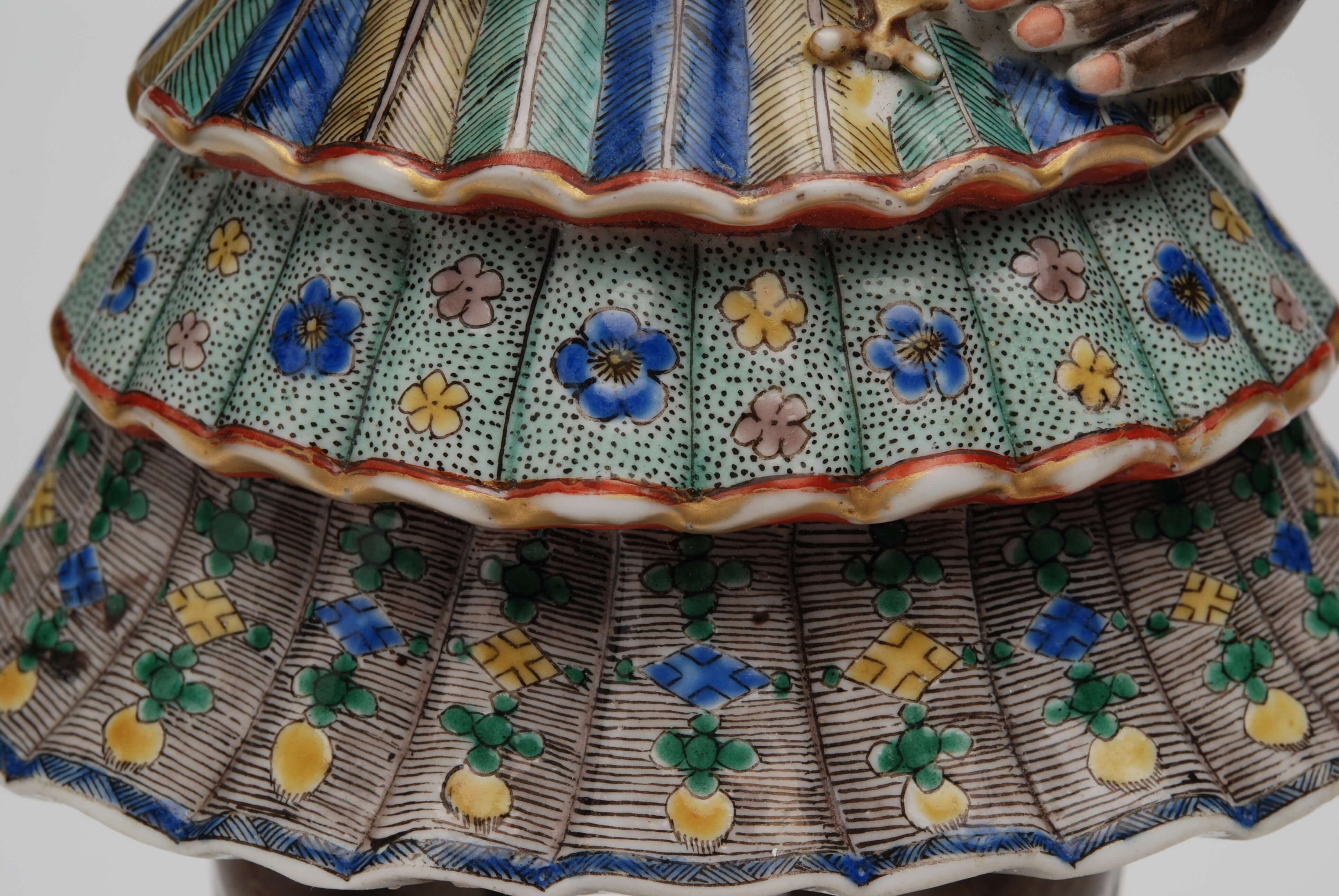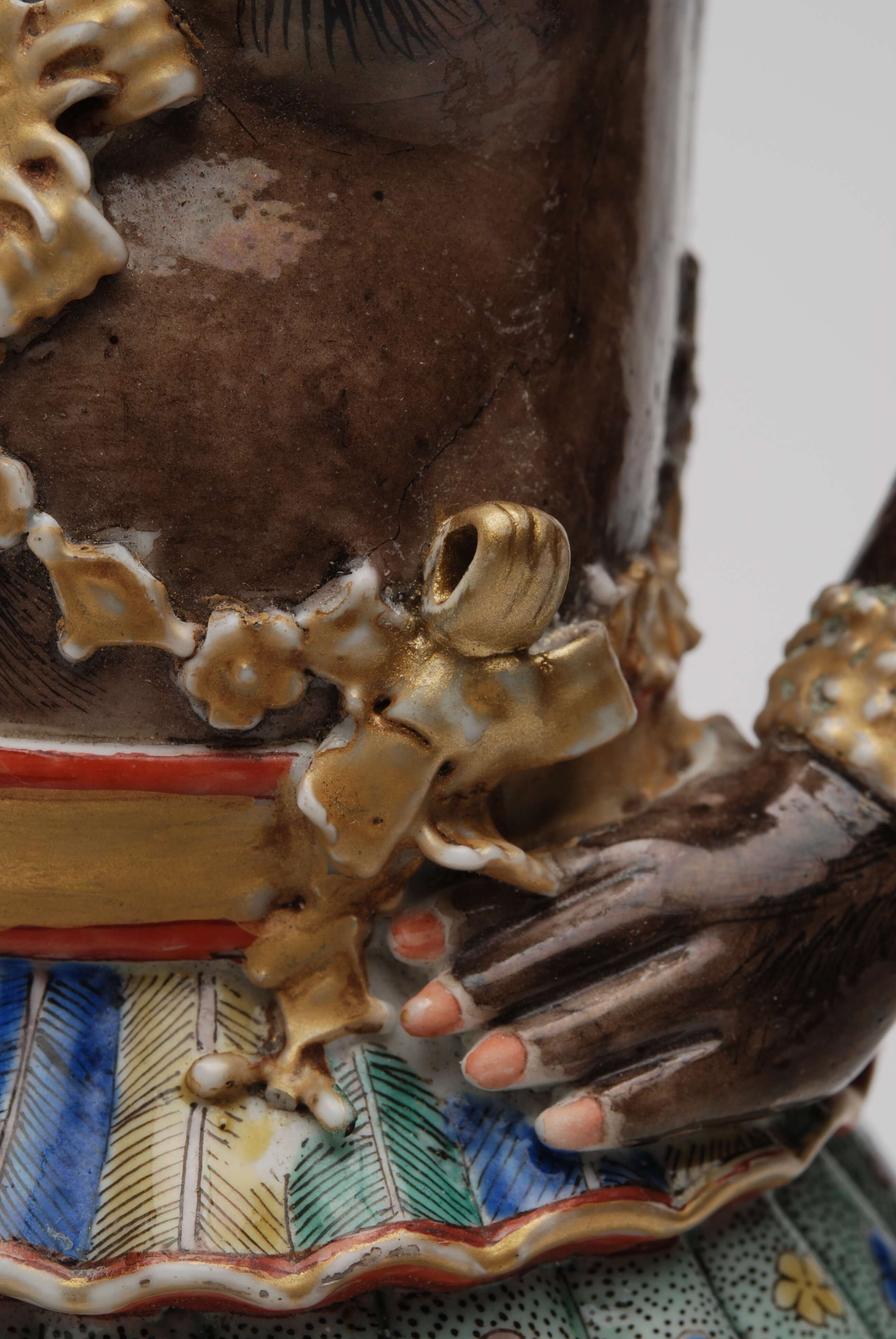 A very rare enamel on biscuit porcelain standing figure, the arms, legs and upper body decorated in aubergine enamels with black details. He stands barefoot and bare-chested, with his left hand on his hip and the right holding a yellow cornucopia. The laughing face has an open mouth and eyes, black eyebrows and a gold star on his forehead. The earlobes are pierced and may once have carried earrings. He dons a thin gold hairband holding back black tightly curled hair - similar to that seen on Chinese Buddhist figures. He wears beaded bracelets, bangles around the ankles and a gold collar around the neck. The three-tiered skirt is decorated in bight famille verte enamels with a strong blue enamel and edged in red and gold bands. The gold order sash across the body, has a central beribboned insignia.