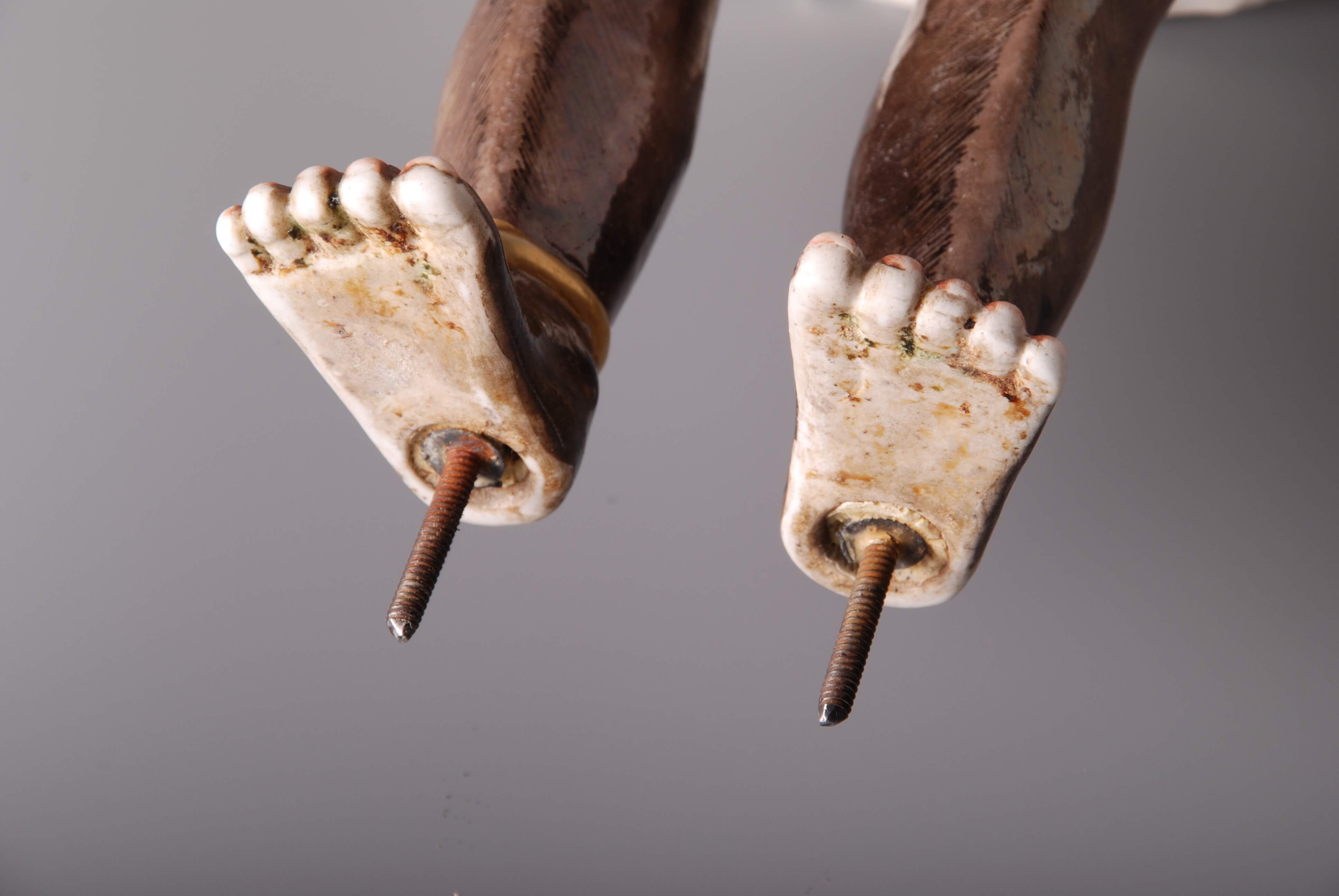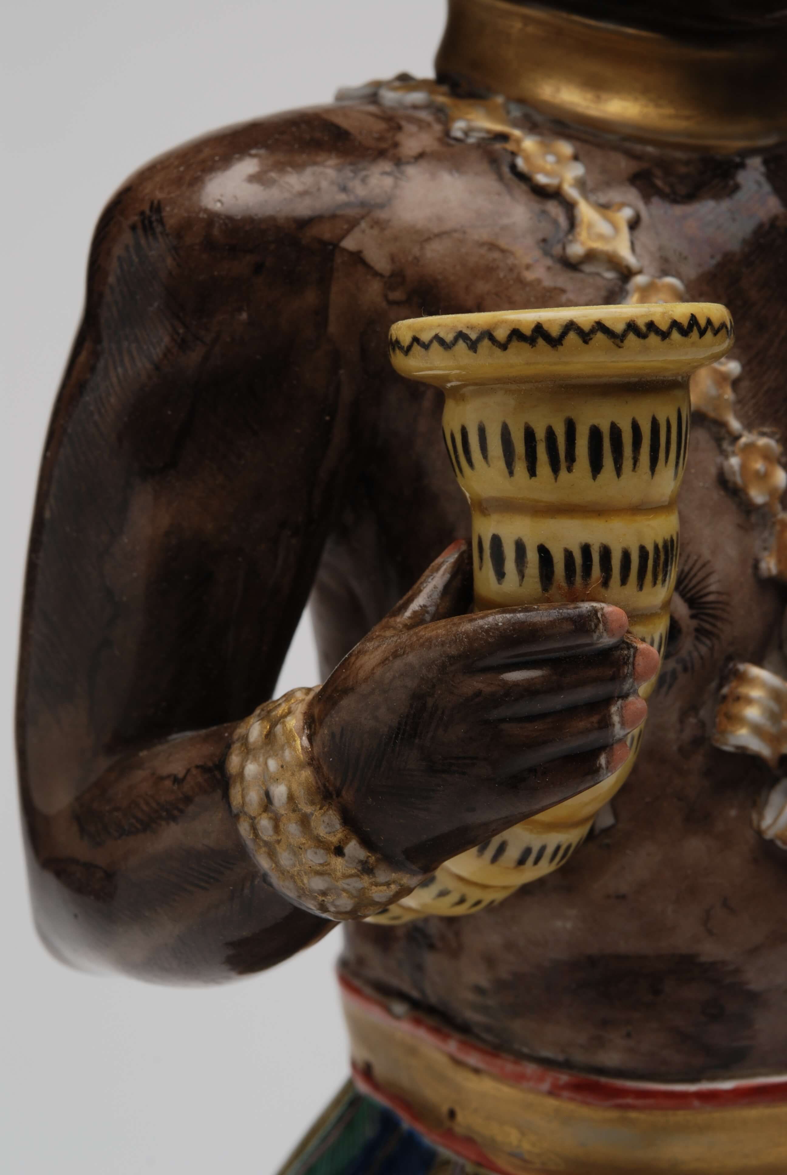 Dark skinned figures were regularly portrayed in the decorative arts in the 17th, 18th and 19th-centuries. Some of the finest examples, made around the same time as the present figure, are in the collection of the Green Vaults in Dresden. Figures by Balthasar Permoser and the goldsmith Melchior Dinglinger created, also wear feathery skirts, illustrations of which were perhaps a source for this figures’ curious attire.