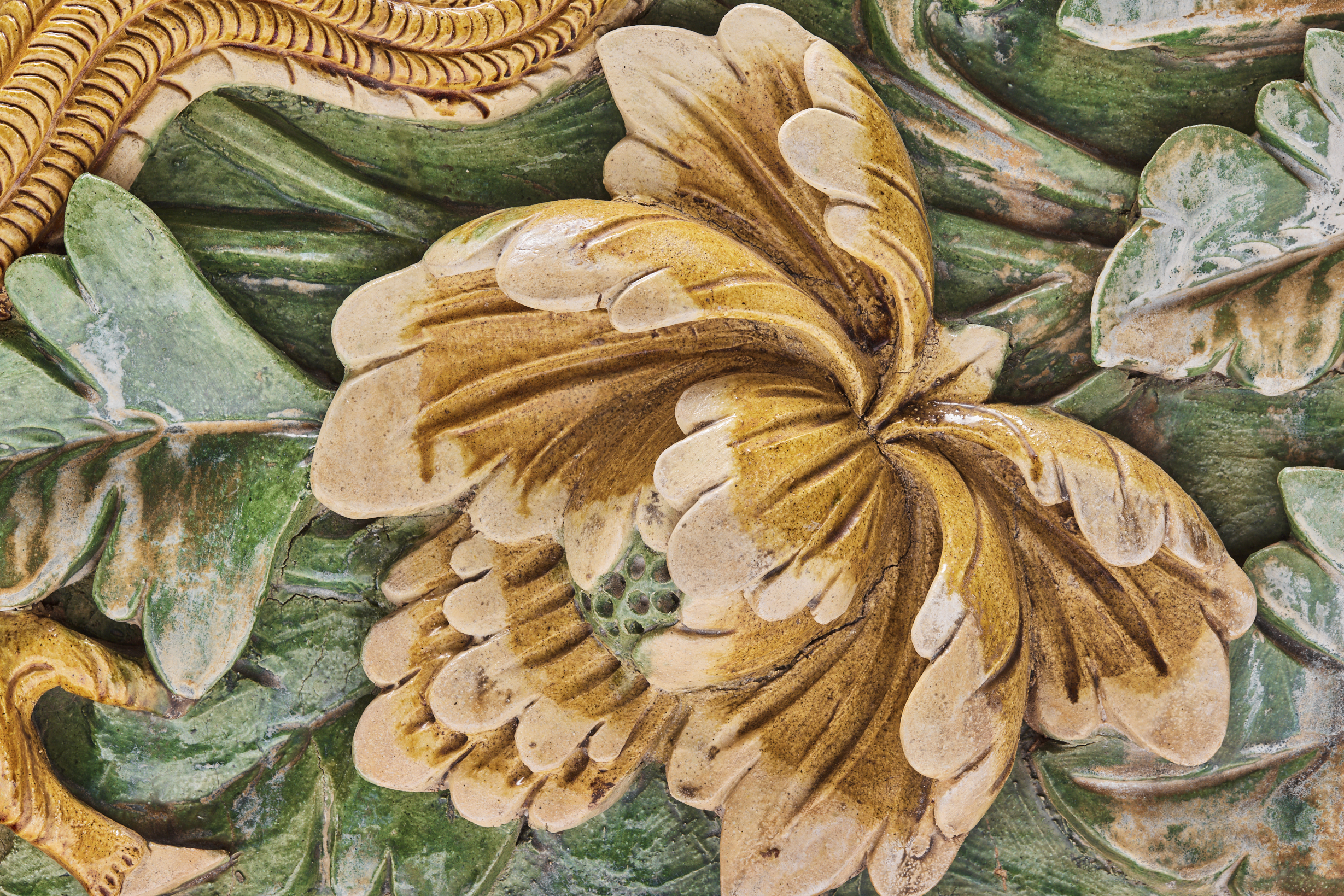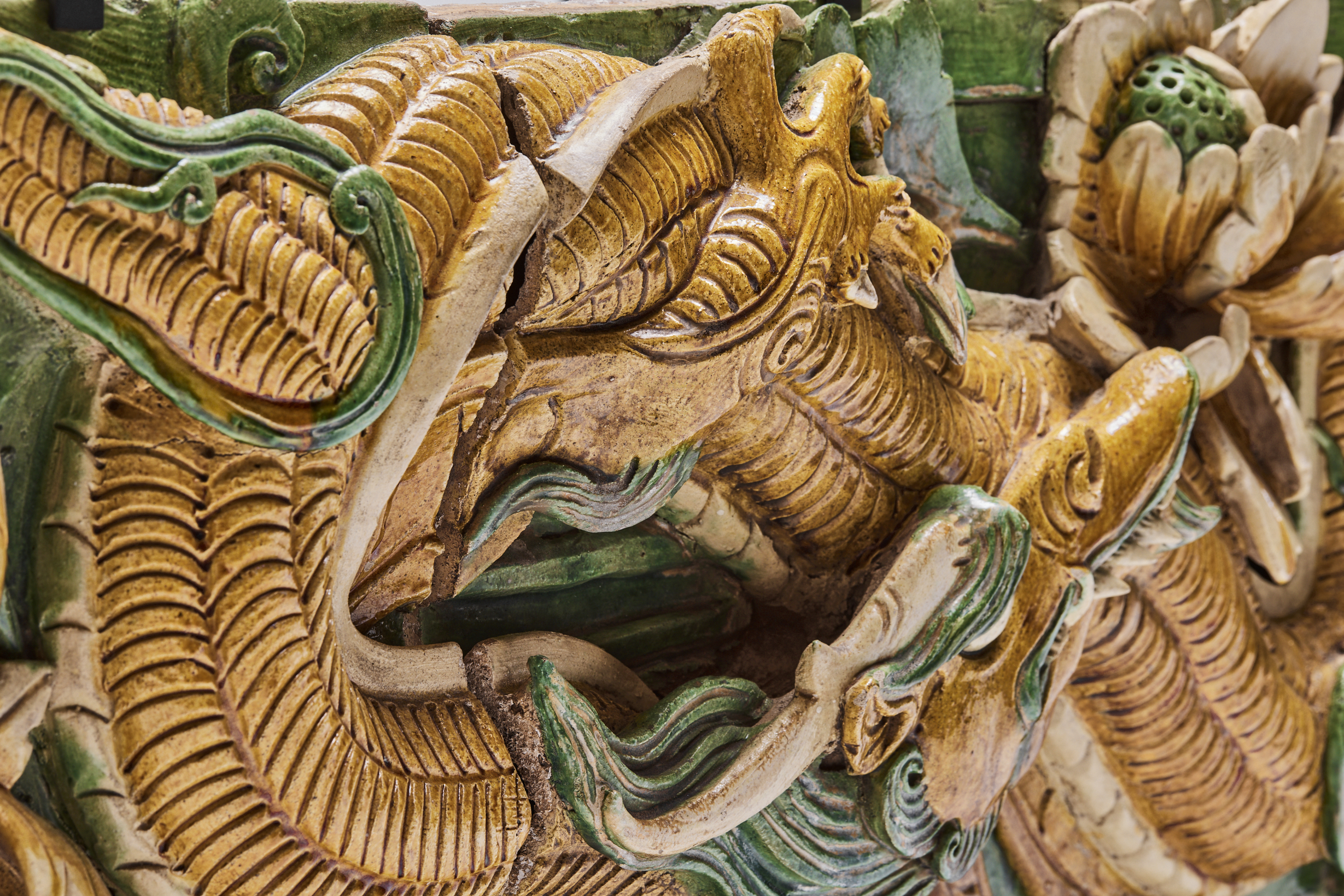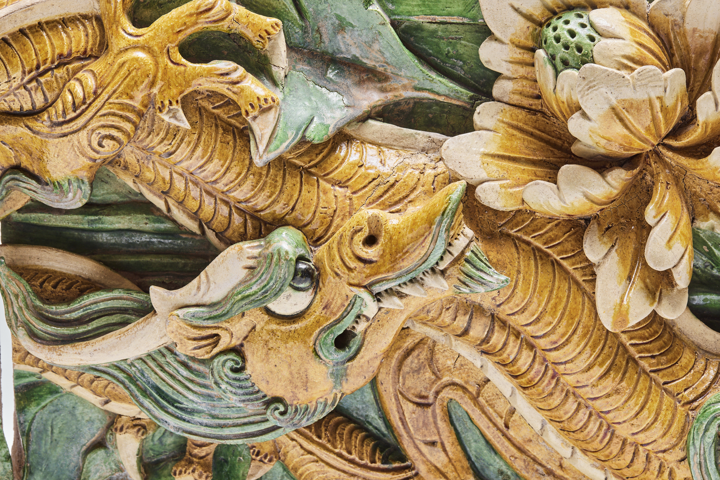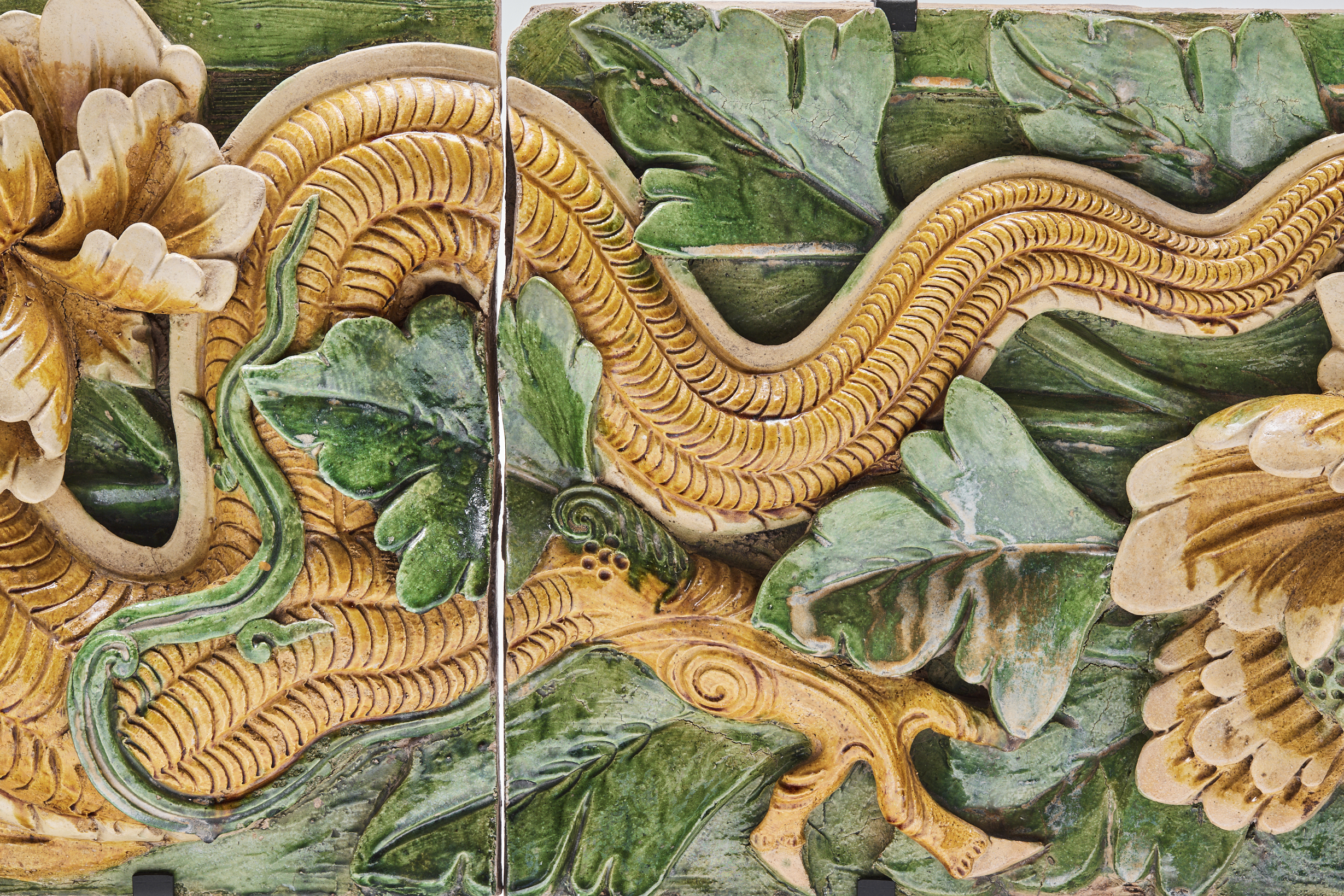 A Chinese glazed tilework panel, comprising three parts, depicting a dragon in high relief amongst foliage and flowers. Set on a green ground, the yellow and green dragon writhes amongst thickly potted green foliage and yellow blossoming peony flowers. These types of panels would have been part of the decorative architectural scheme of a building, possibly a temple. Architectural ceramics (liuli), were produced in moulds and then individually finished by hand, the amount of detail varying according to the importance and function of the building. These wares are usually thickly potted from clay and fired at low temperatures. The lead-fluxed glazes used are predominantly from the sancai (three colour) palette of green, yellow and brown, though some examples of tilework are found with a purplish blue glaze.