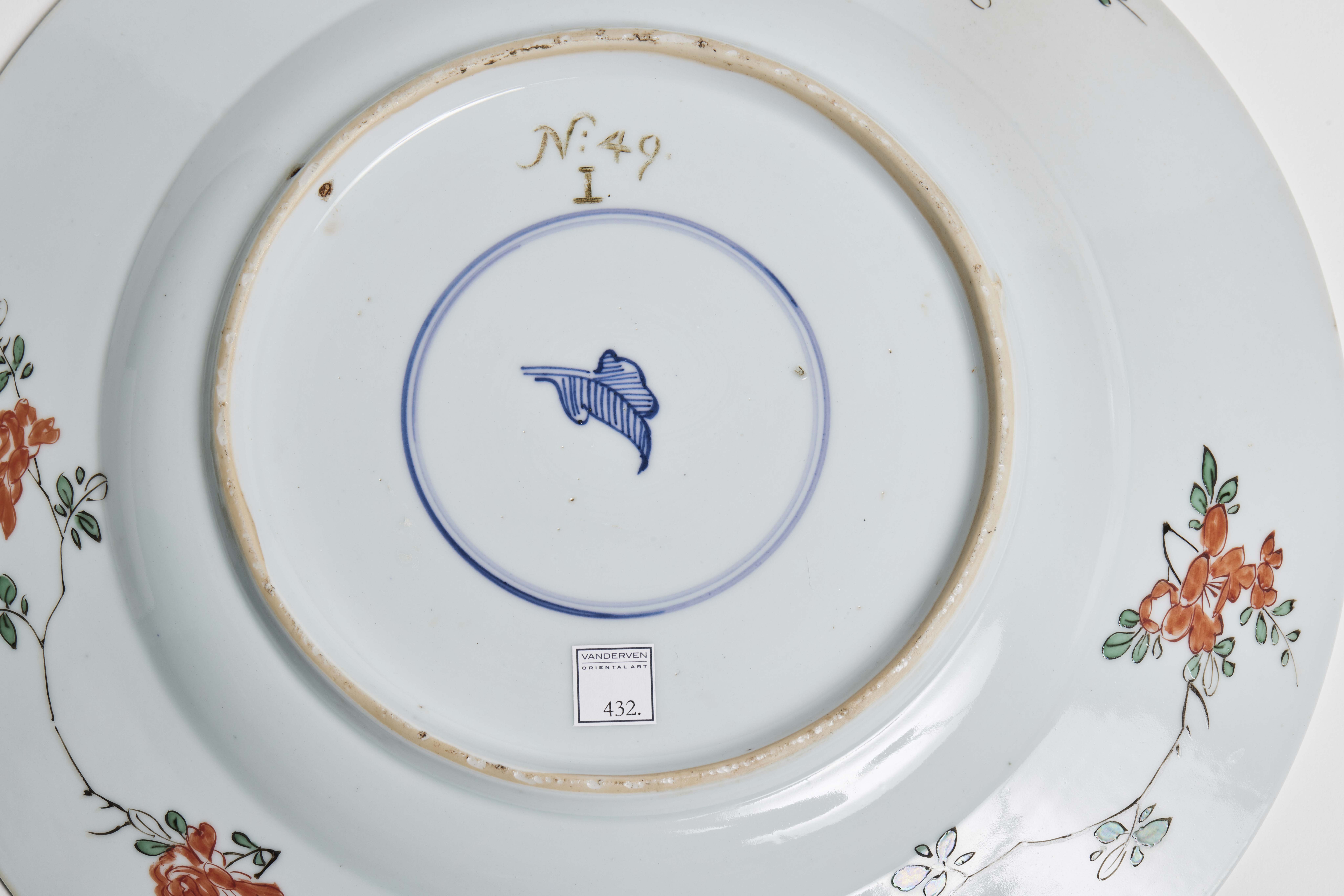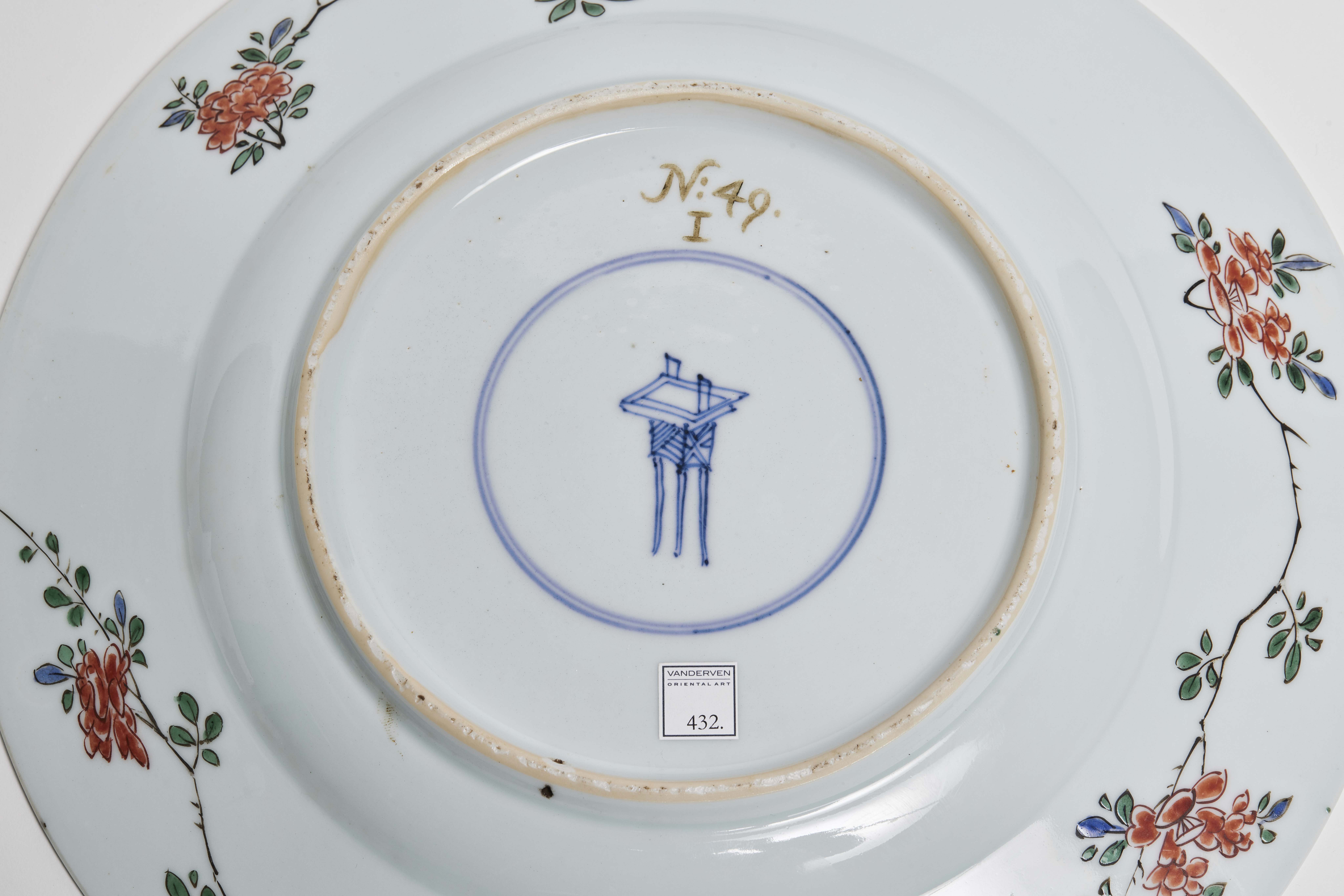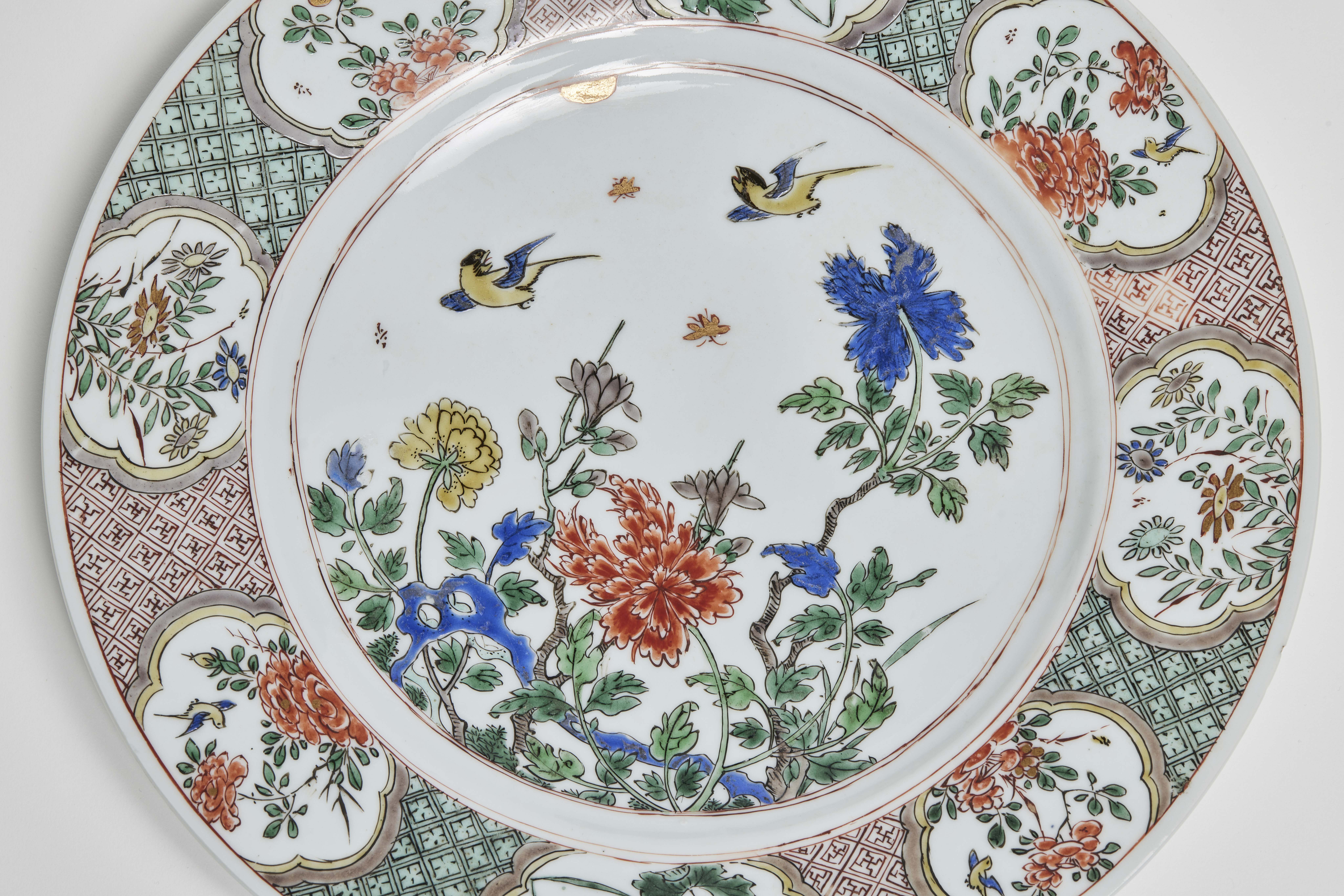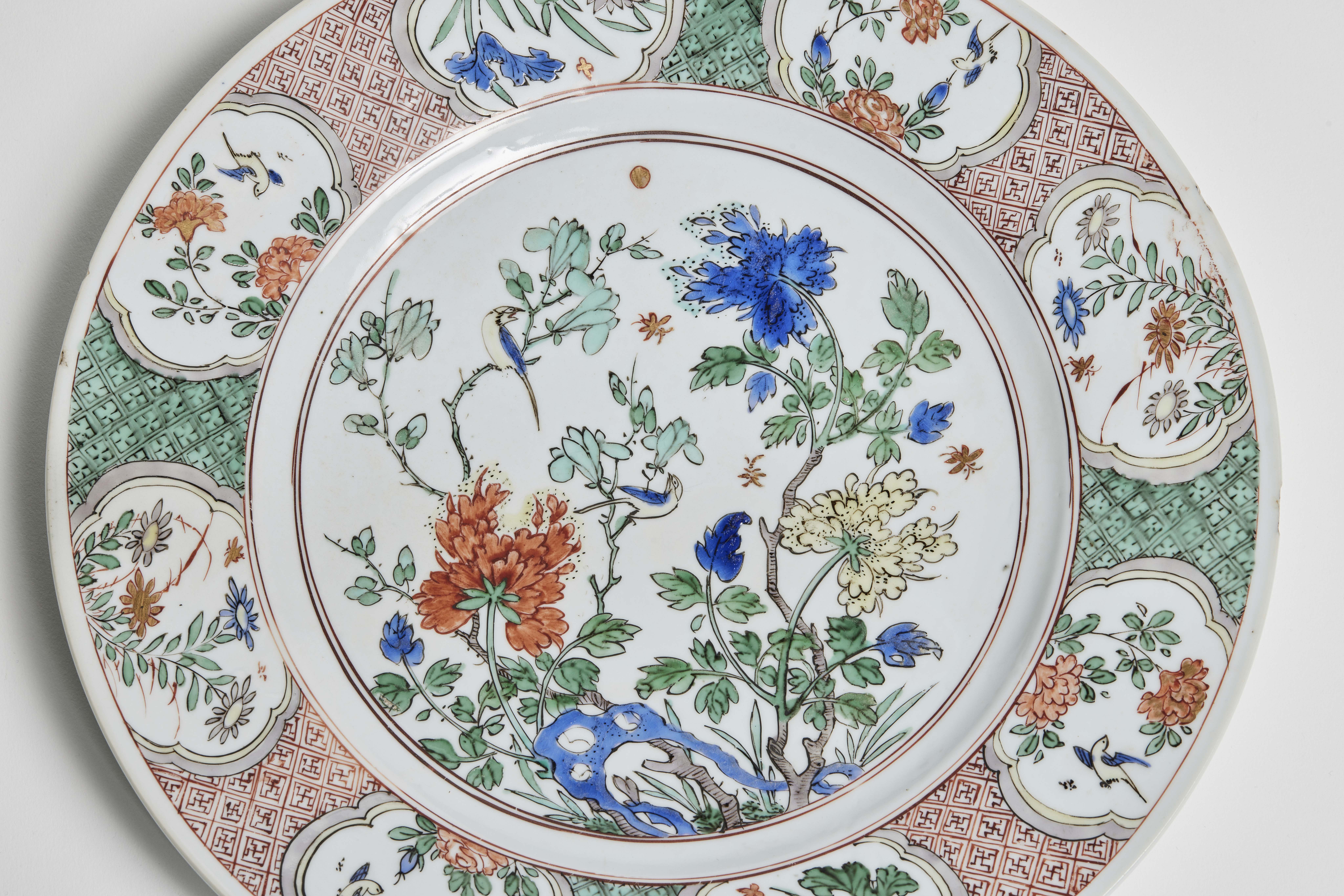 A pair of porcelain plates, painted with overglaze enamels in the famille verte palette. The large circular central panel, within in a double red line, is decorated with brightly coloured flowering boughs of peonies and magnolias growing around rockwork. Overhead are a pair of birds in flight and gold and iron-red insects flutter under half a gold sun. The wide rim has eight lobed cartouches in the reserve, with a yellow and aubergine double border; they contain four varieties of flowers including peony, prunus blossom, aster and lotus. The cartouches stand against alternating turquoise and iron-red liewen diaper ground. The reverse of the rim has three floral sprays, with green leaves and red flowers. The underside is decorated with two concentric circles in underglaze cobalt blue, one with a central artemisia leaf the other with a stylised archaic ding. They are both clearly incised and with the blackened inventory numbers N:49 I, corresponding to the collection inventory of Augustus the Strong, The symbol ‘I’ denotes the category ‘Green Chinese porcelain’.