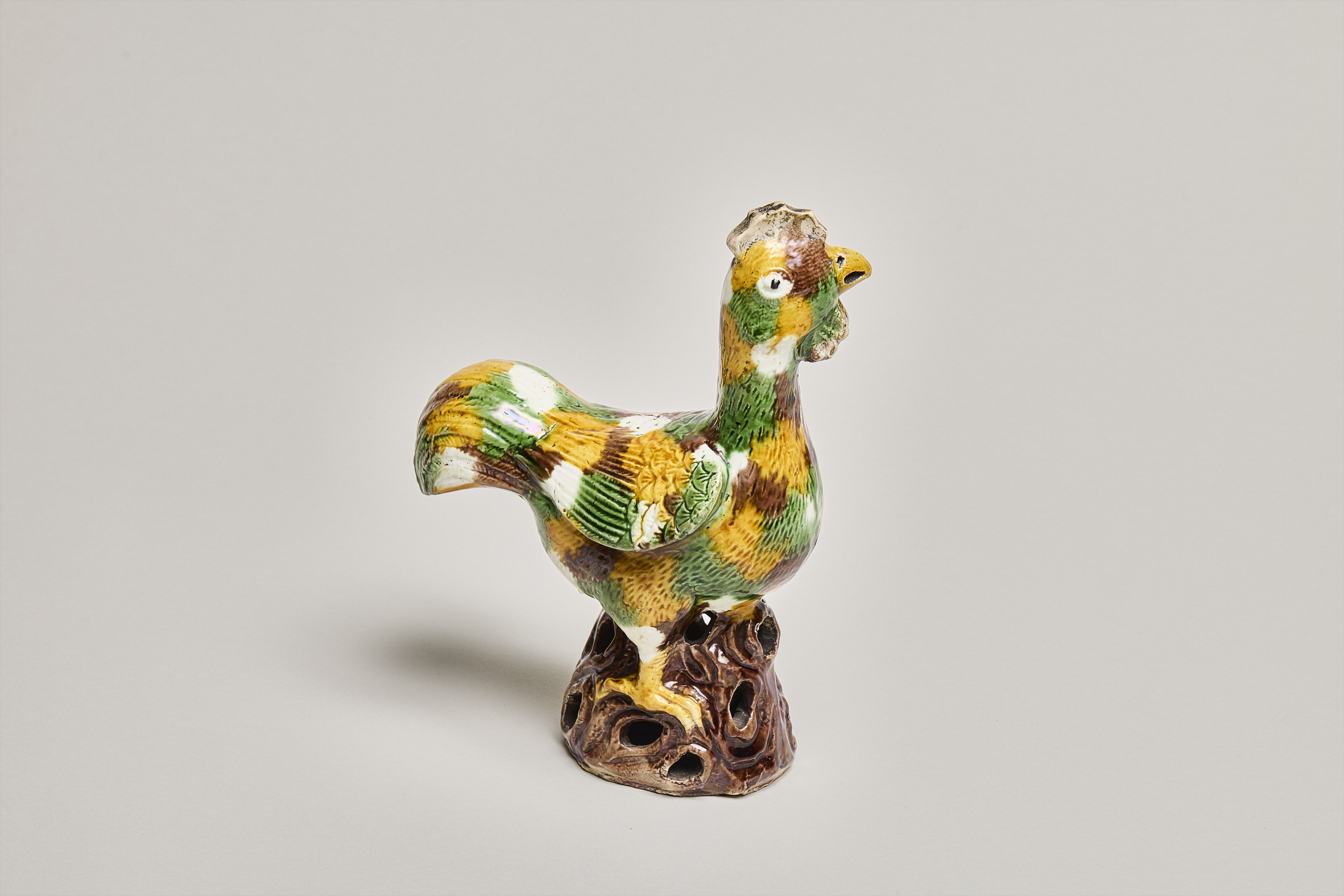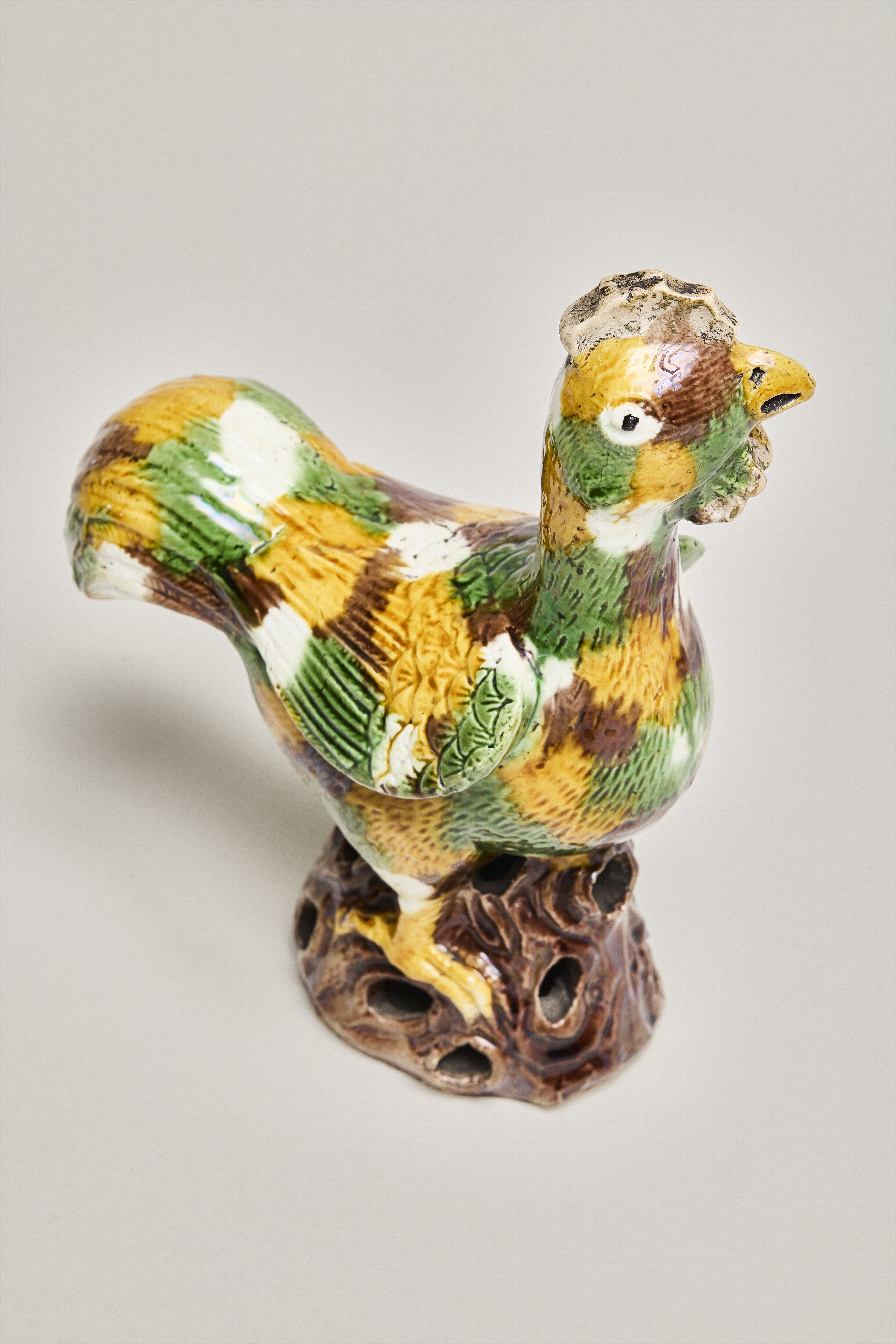 An enamel on biscuit figure of a cockerel, decorated all over in bright Egg & Spinach enamels. The cockerel, with its large feathery tail, stands upright and looks slightly to the left. The contours of feathers on the body, wings and tail are incised into the porcelain body. The prominent wattles are left uncoloured and the comb is unglazed biscuit. It stands on a brown enamelled pierced rockery base, which is left unglazed on the bottom.