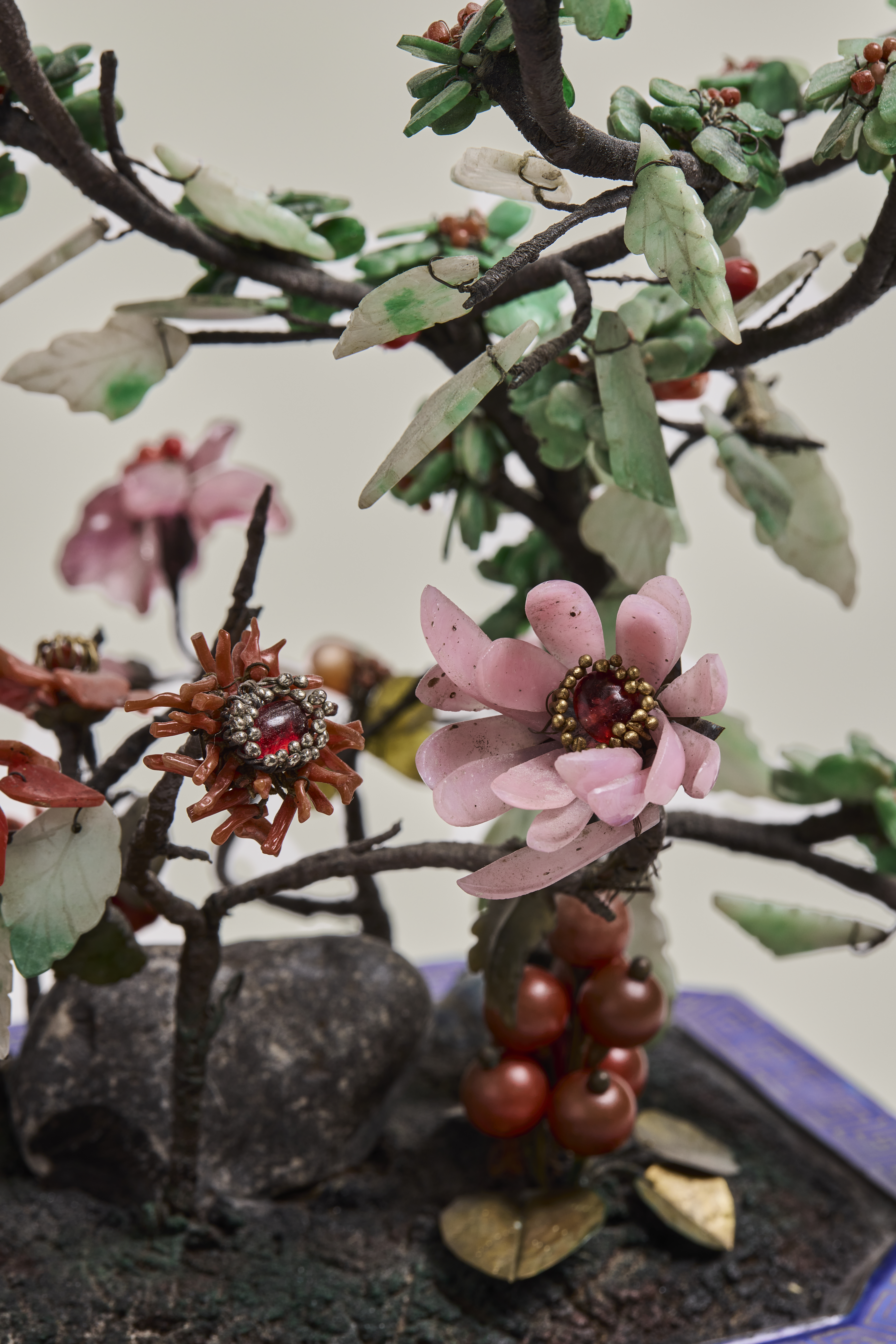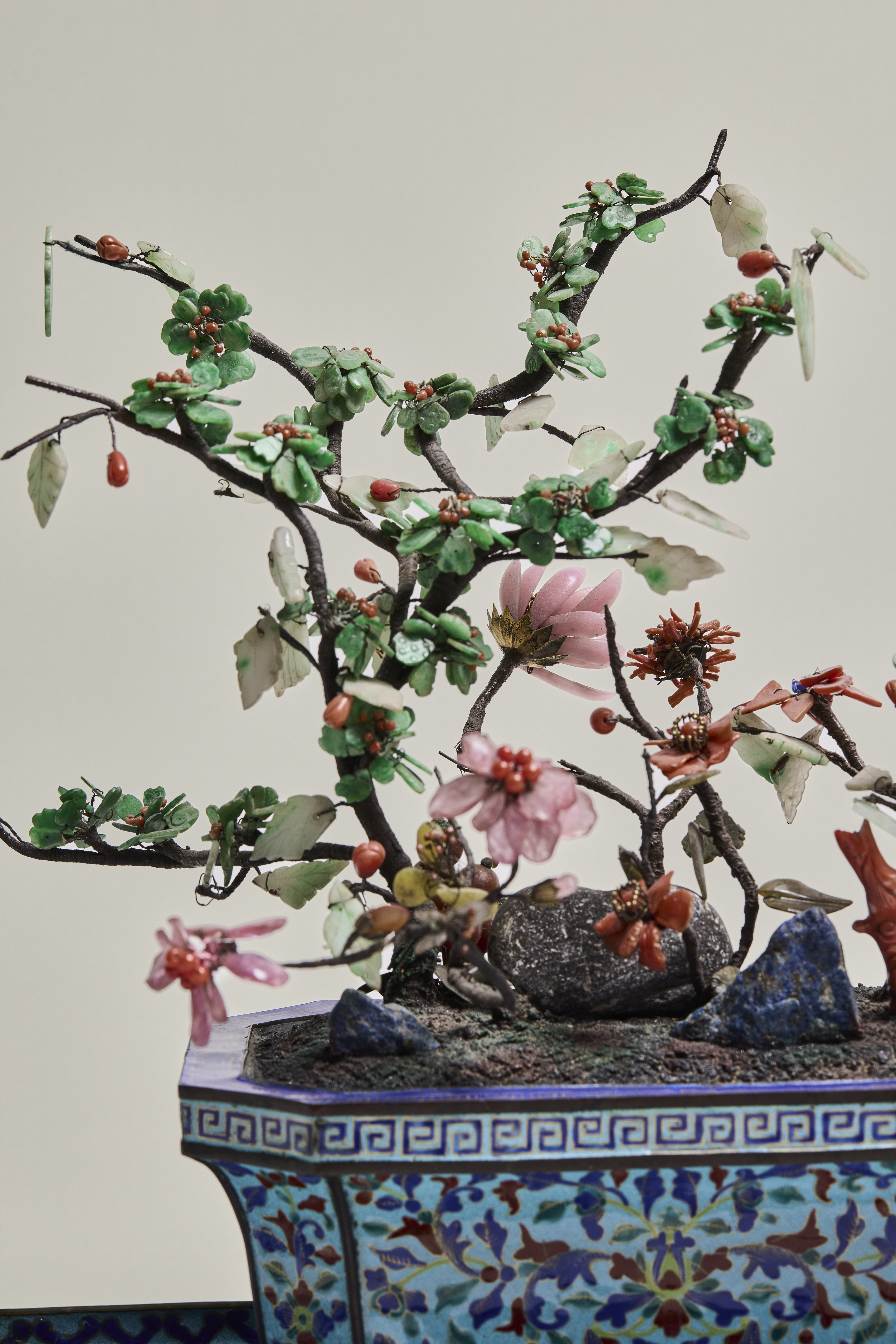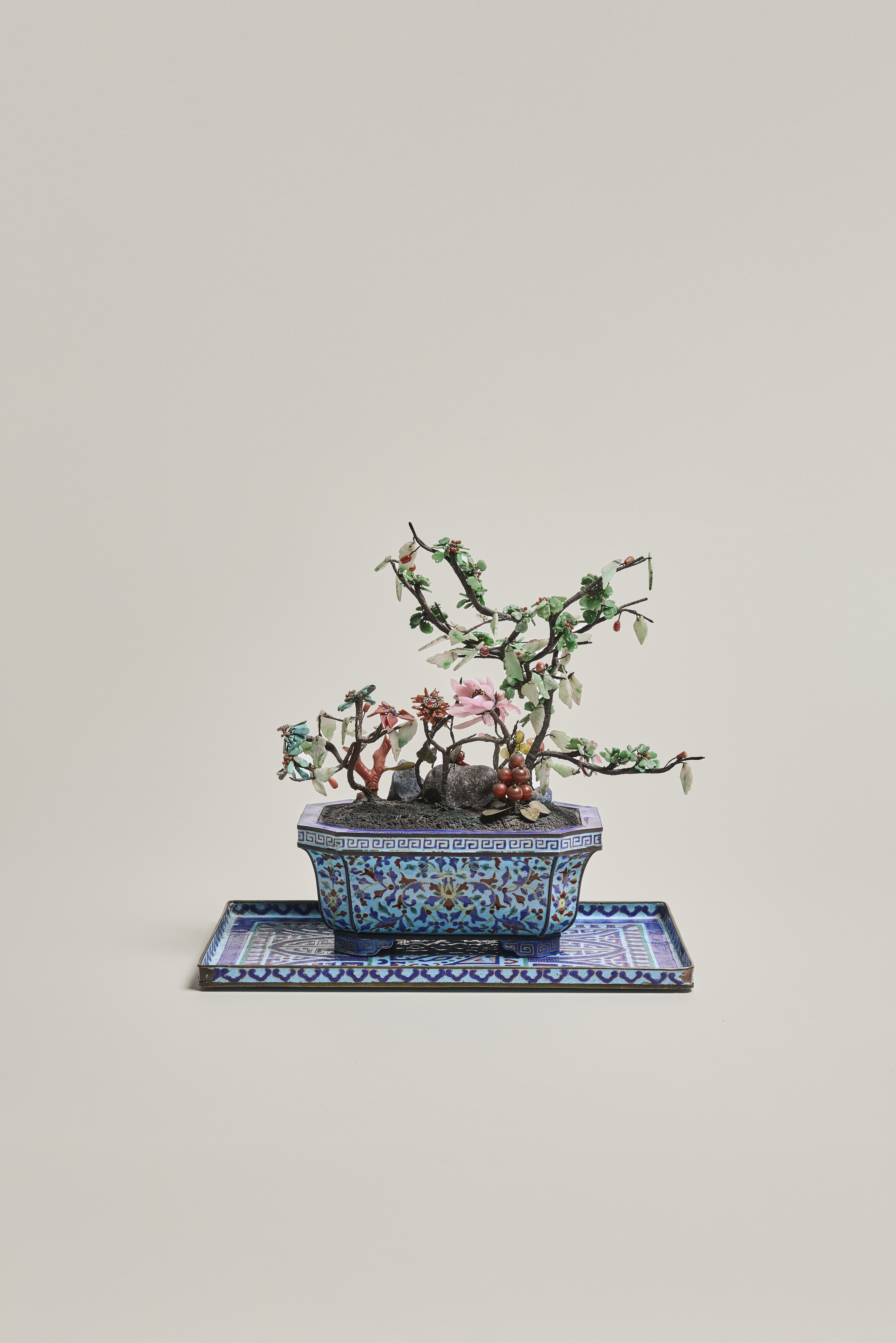 An octagonal canton enamel jardinière, imitating cloisonné, decorated all round with flowering branches. The broad edge has a key-fret pattern on the top and side and it stands on bracket feet. It is 'planted' with a large and small blossom tree with pale jade leaves and blossoms with bright green petals and coral pistils. The trees grow from a ground laid with three miniature boulders and other flowering shrubs with coral and rose quartz petals. It stands on a rectangular tray with archaic motifs.