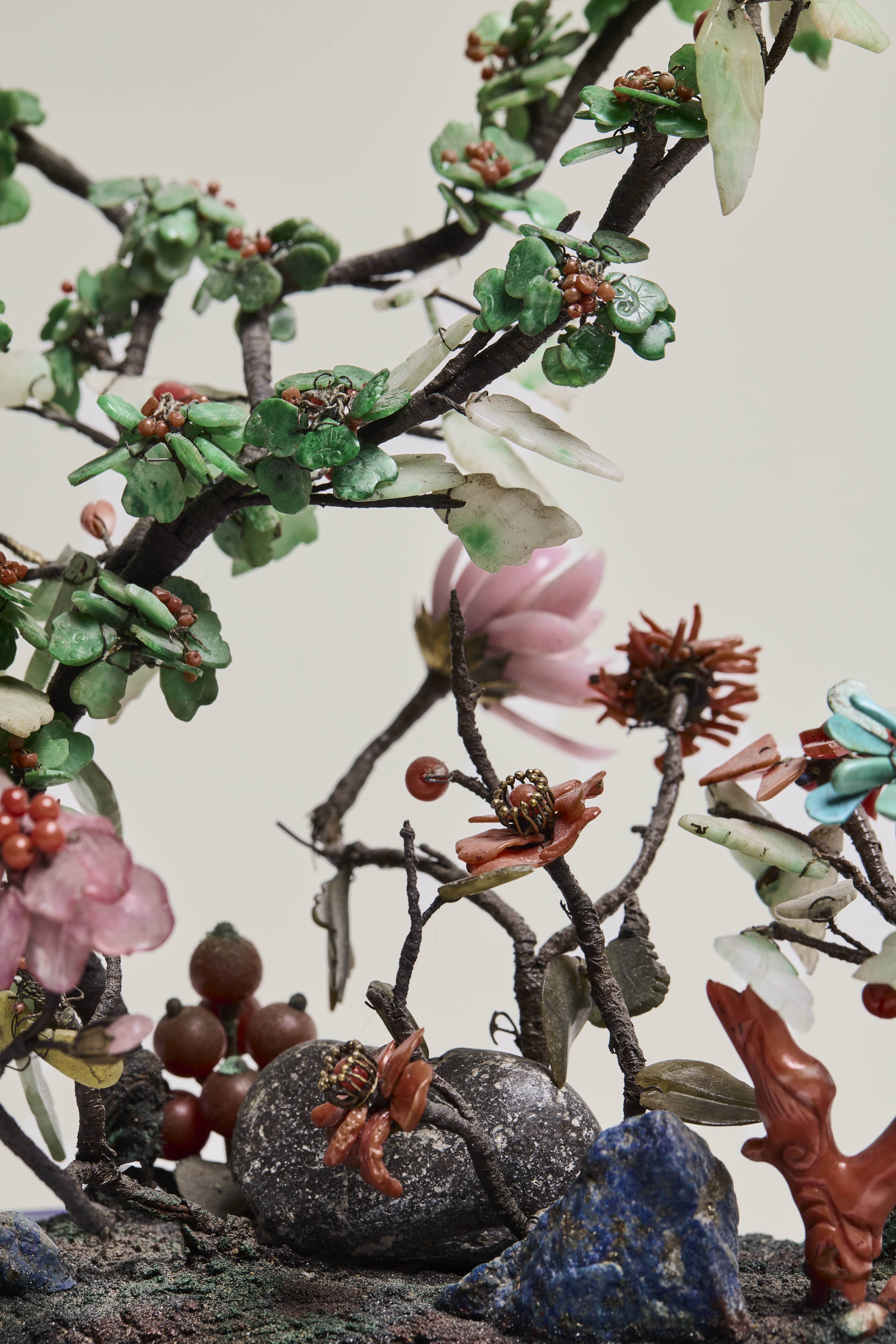 A number of miniature gardens made with semi-precious stones are in the Palace Museum, Beijing. The Asian Civilisations Museum has two potted landscapes with vines (Acc.nr. 1995-03487) and The British Museum, London has a similar example (1991,0622.1.a-b). The Chinese Pavilion at Drottningholm Castle in Sweden, has marble containers with Ivory flowers (HGK 174, 173, 1777:12) and the National Trust collection has several such tree containers, including one at Hardwick Hall (NT 1129825).