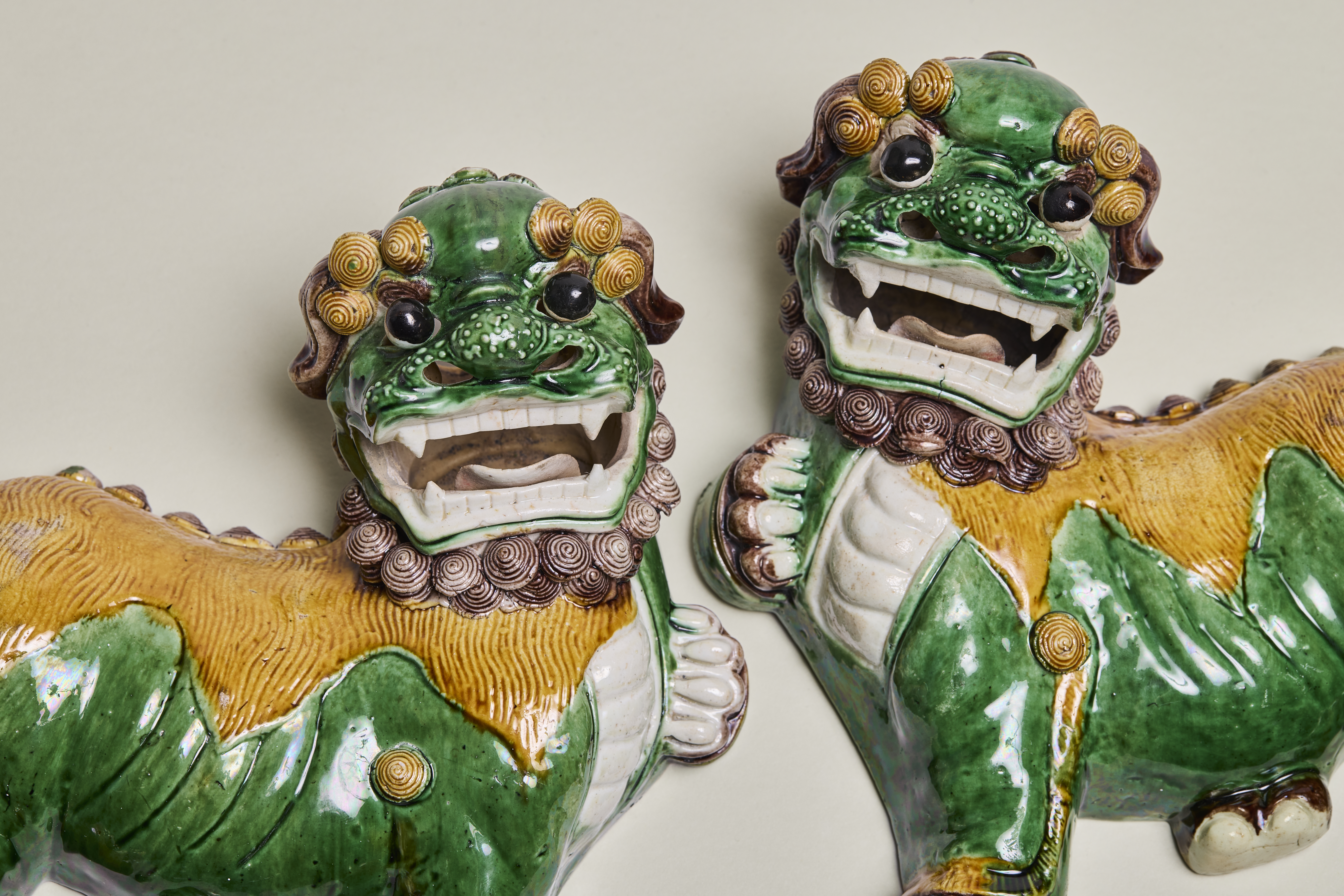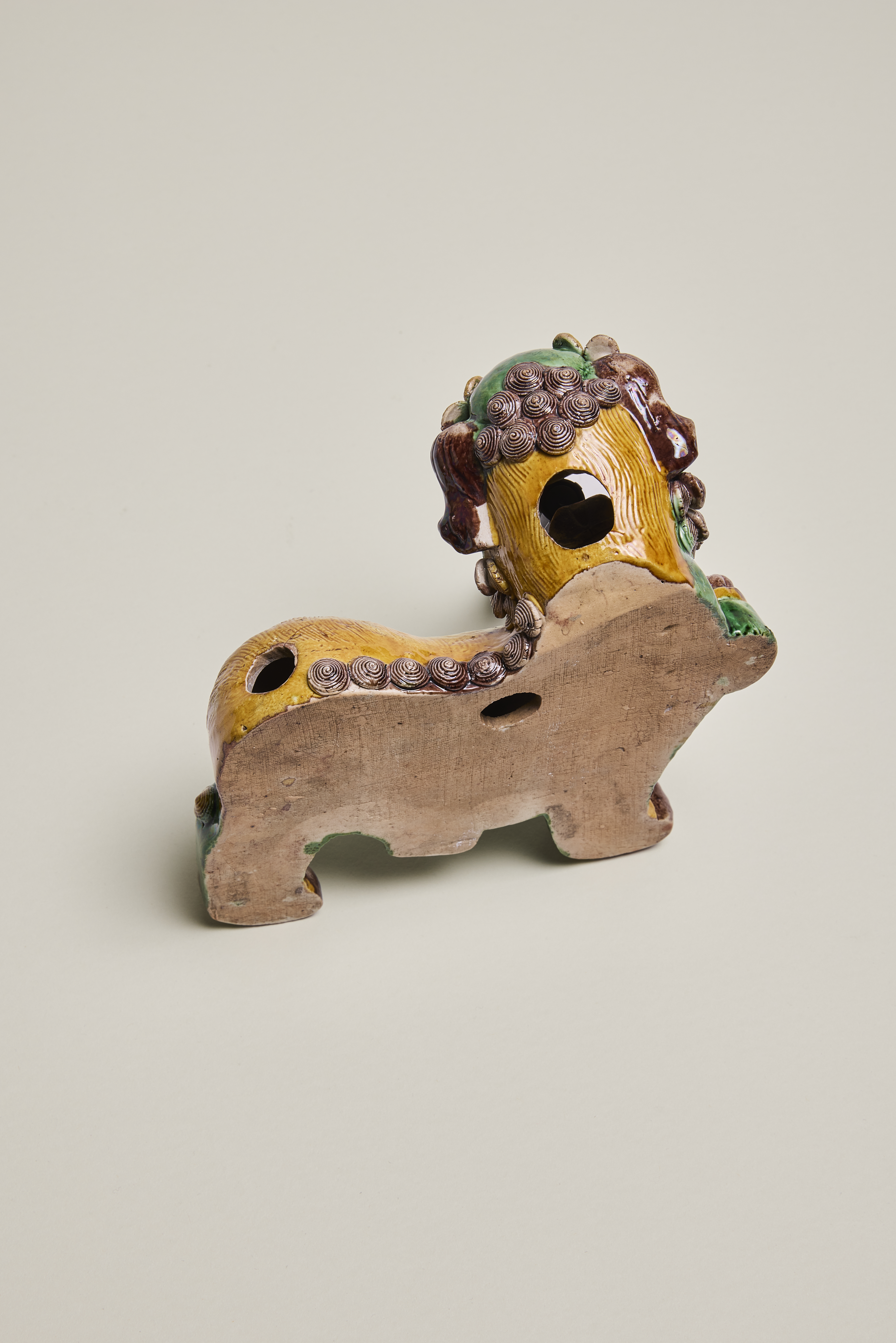 A pair of very unusual enamel on biscuit porcelain wall vases, in the shape of lion dogs viewed from the side. Made as pendants, one has its head turned to the right, the other to the left. They each have a raised front paw, two standing paws and a paw which is just visible under the belly - creating an optical illusion of a fourth leg we cannot see. They both have two apertures in the top, one on the head and another slightly smaller one on their hindquarters. They are glazed in the distinctive tri-colour sancai palette of yellow, green and aubergine-brown. The backs are unglazed with an opening for hanging.