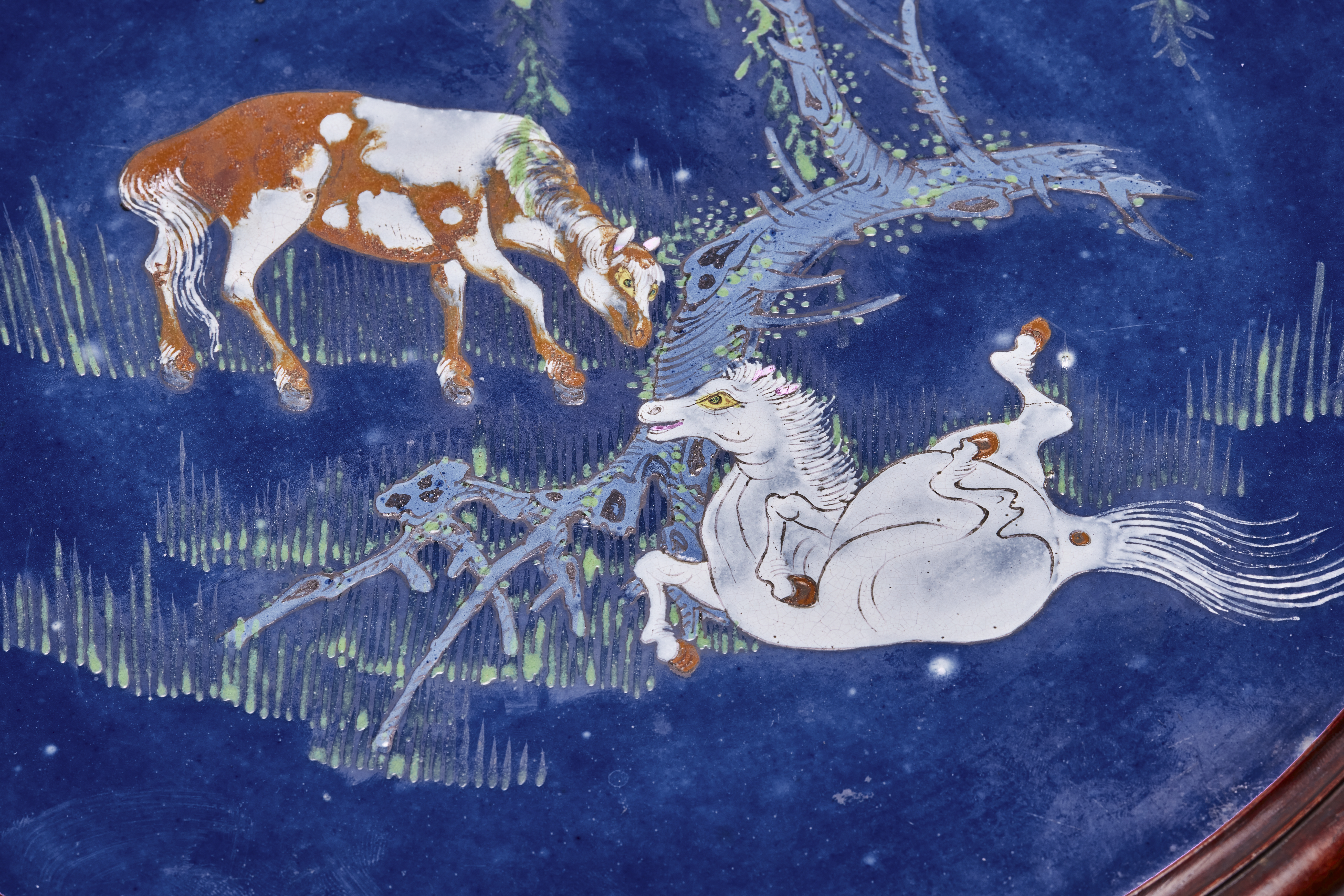 A pair of large circular enamel on biscuit plaques, painted in an unusual loose style using thick coloured enamels on a bright blue ground. The animals depicted are rendered in detail, whereas the trees and plants are more loosely represented. One plaque portrays a caparisoned white elephant amongst bamboo, it has a long yellow saddle blanket decorated with plum blossom branches. The bridle, reins and breeching behind its haunches are blue; on its chest is a large red tassel. The other plaque is of two horses in the grass by a willow tree - possibly two of the eight horses of Mu Wang. The grazing horse under the tree, is brown with white patches. The white horse in the foreground is frolicking on the ground, hooves in the air. The horses as well as the elephant have yellow eyes.