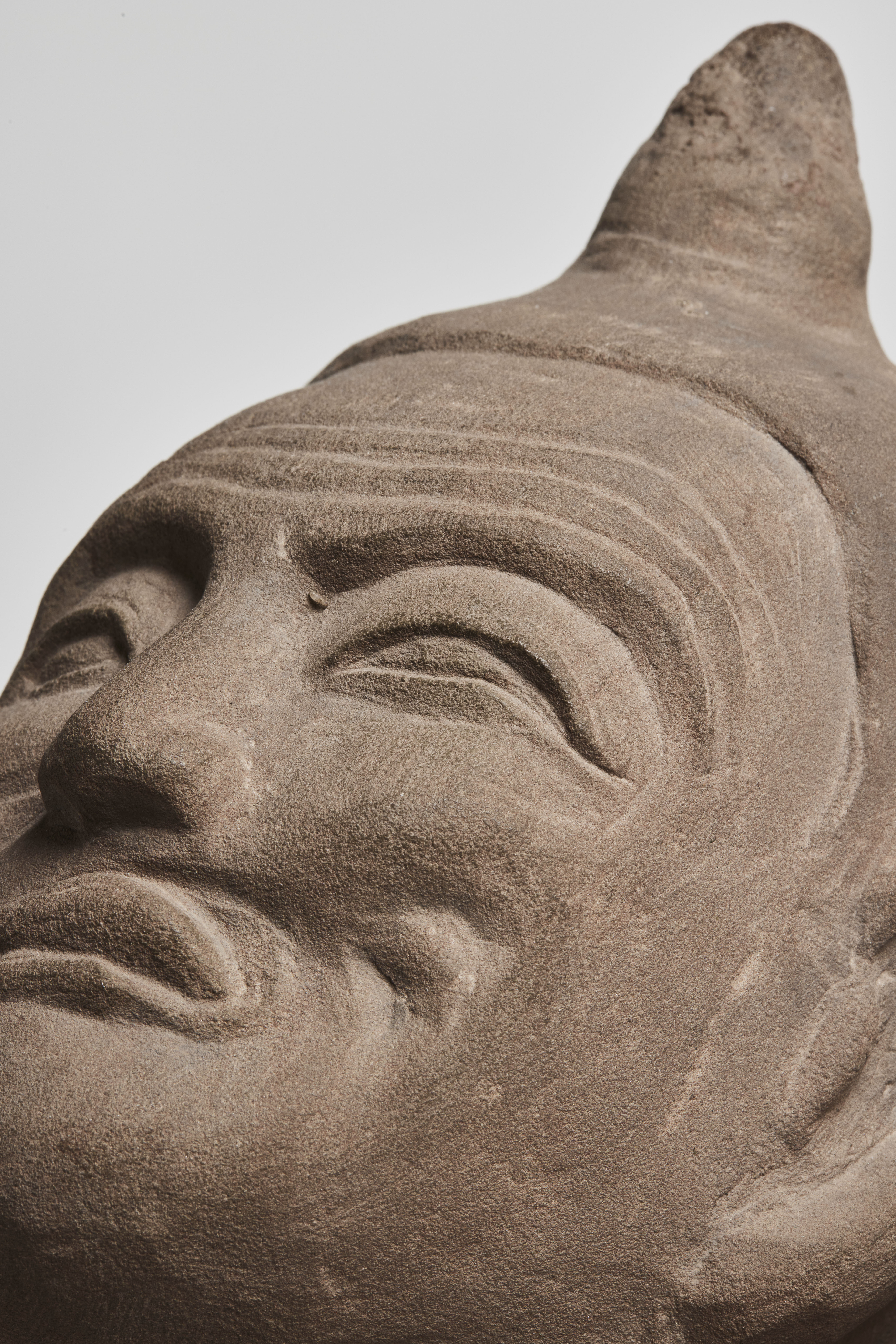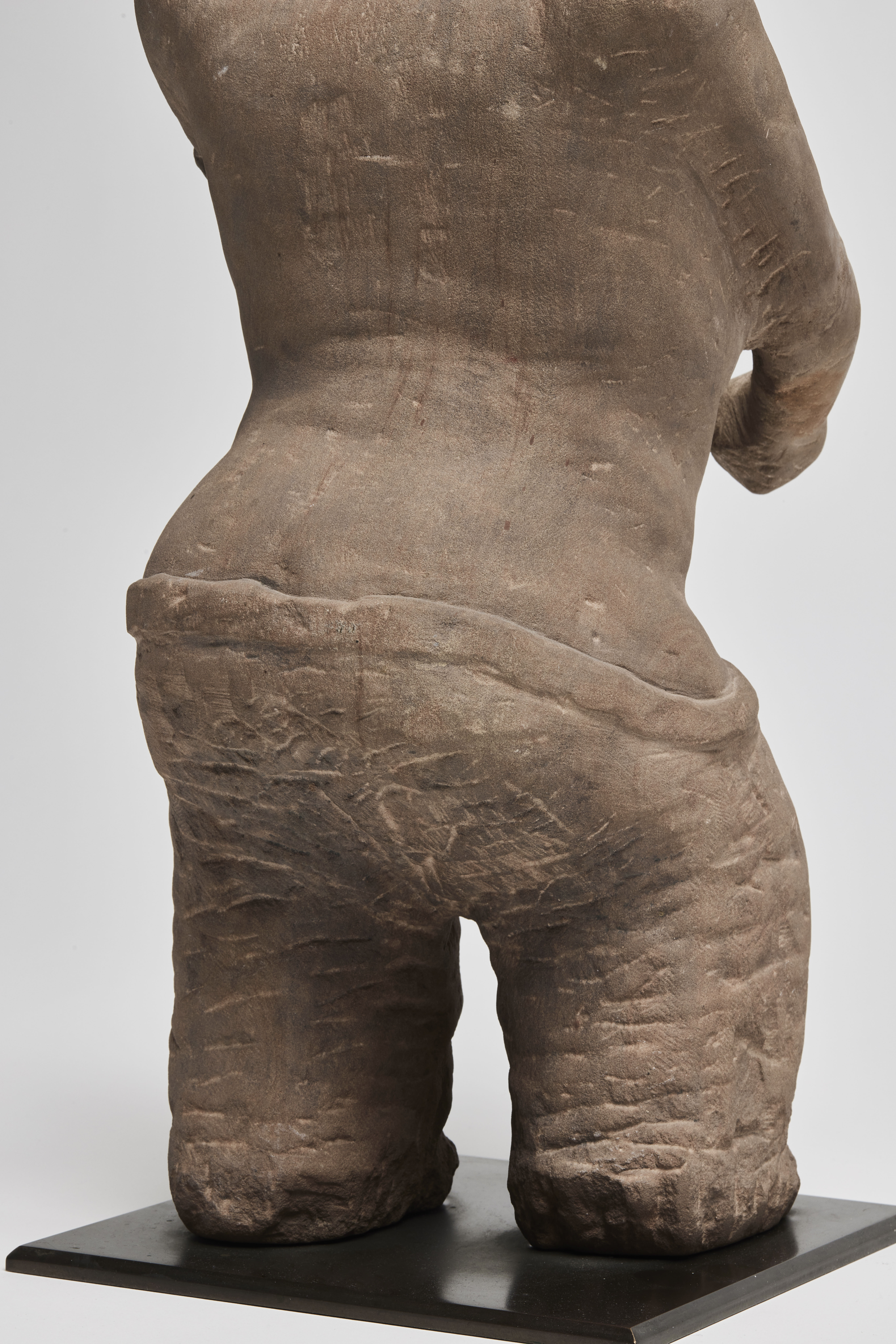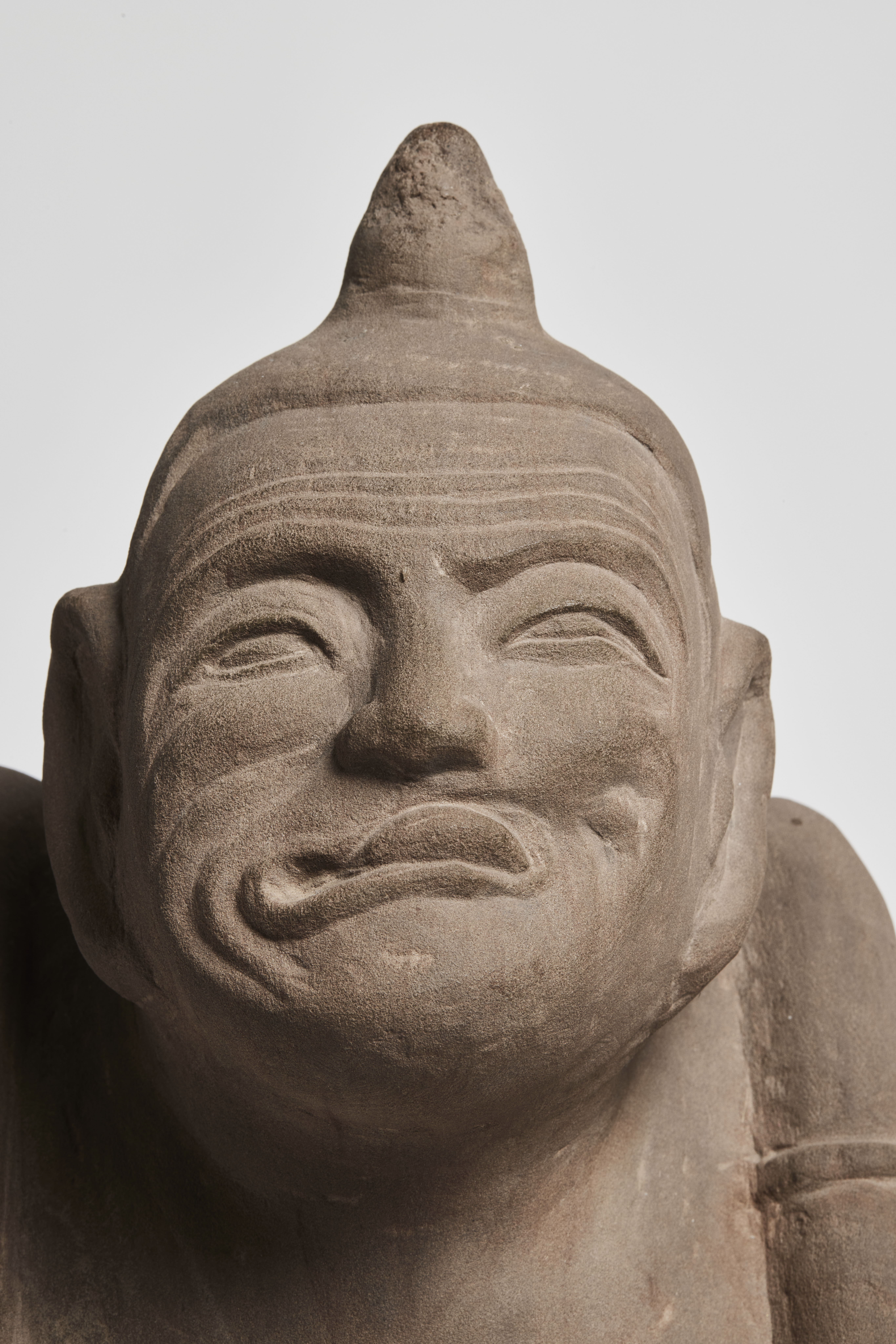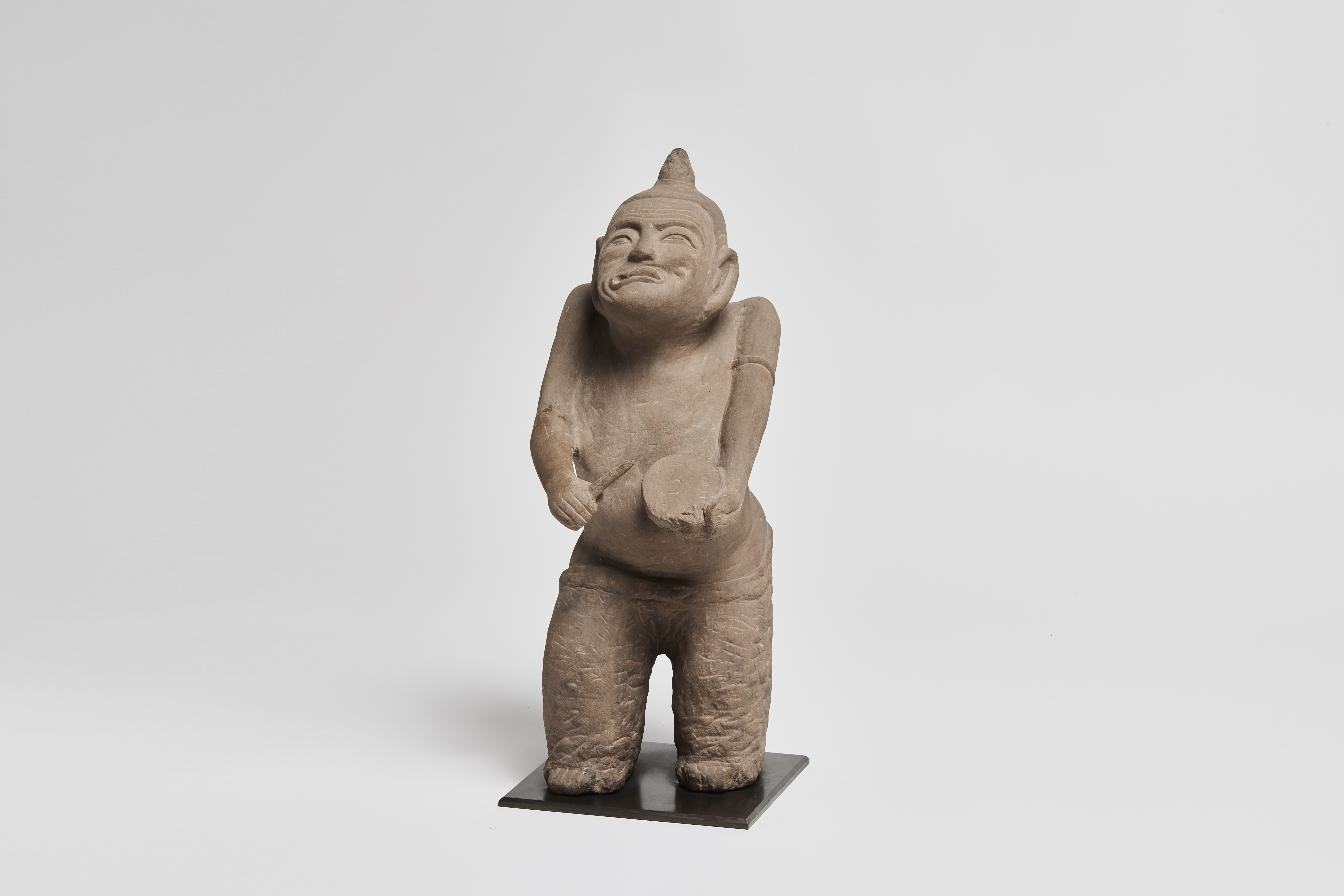 This very rare carved stone figure of an entertainer, is captured whilst performing. He has a very exagerated facial expression, head thrown back, forehead wrinkeled, eyes squinting and his tongue sticking out. He has a slightly squat body, with his back arched showing an ample belly. He stands upright with knees bent; in his left hand he holds a small round drum and in his right he holds a beating stick. His upper-body is unclothed except an armband on his left arm. He wears low-slung voluminous trousers, with a sagging waistband, just about covering his bottom half. On his head he wears a close fitting cap tied over a pointy bun. The comical and caricatural posture and facial expression, show the sculptor’s desire to immortalise the performance mid-act. Drummers such this specialized in a kind of part-spoken, part-sung storytelling called shouchang.