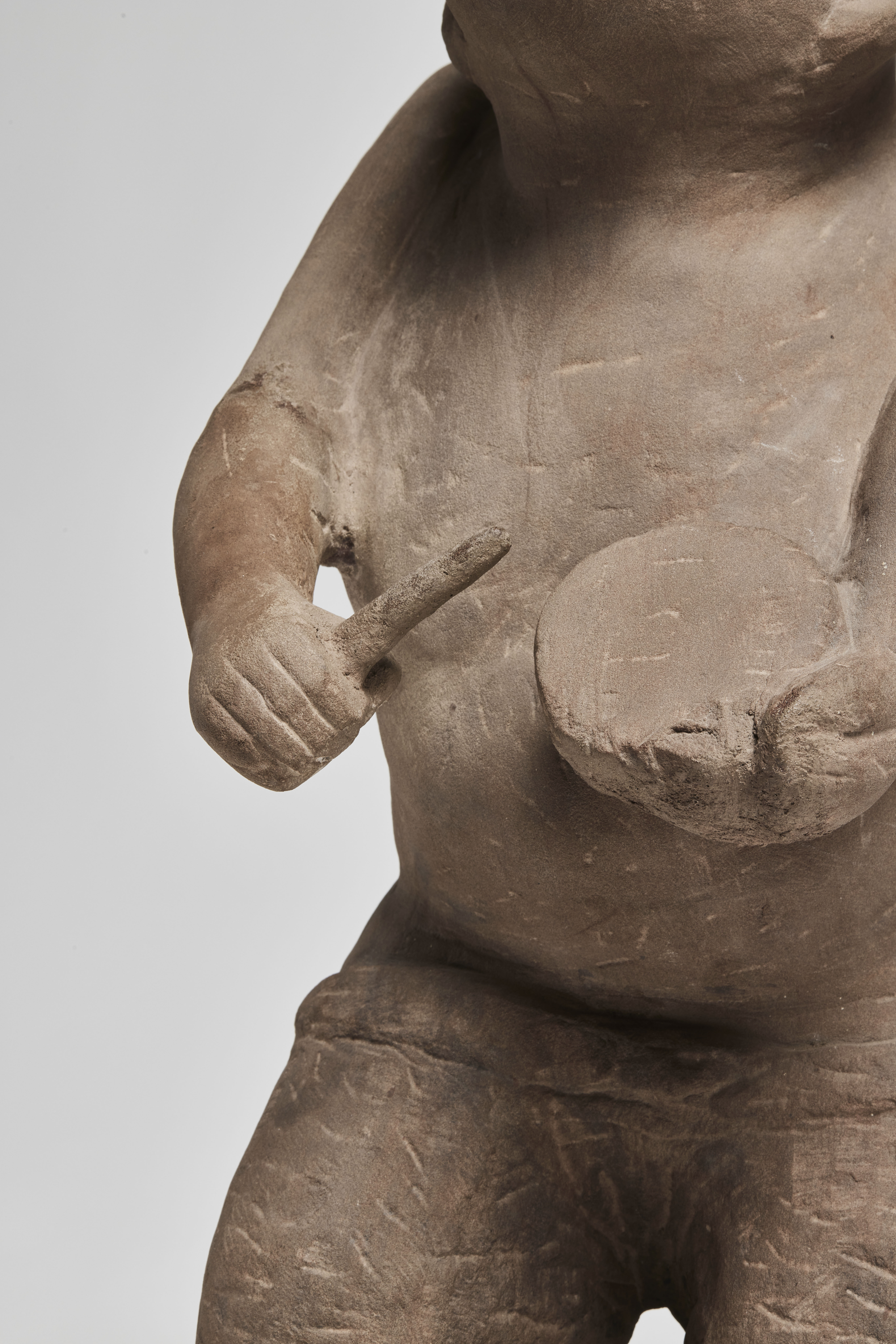 The comical appearance, silly expressions and exaggerated gestures of these figures are part of the Shouchang story-telling performance - perhaps comparable to that of a court jester. The body shape may indicate these figures were perhaps dwarfs, who are generally known to have been popular as Chinese court performers. It is known that native as well as foreign dwarfs trained as acrobats, jugglers, tightrope walkers, dancers and musicians. These exotic entertainers formed troupes, which circulated in China from region to region, entertaining all levels of society. Similar entertainers also appear on tomb tiles, depicting scenes of juggling and sword balancing.