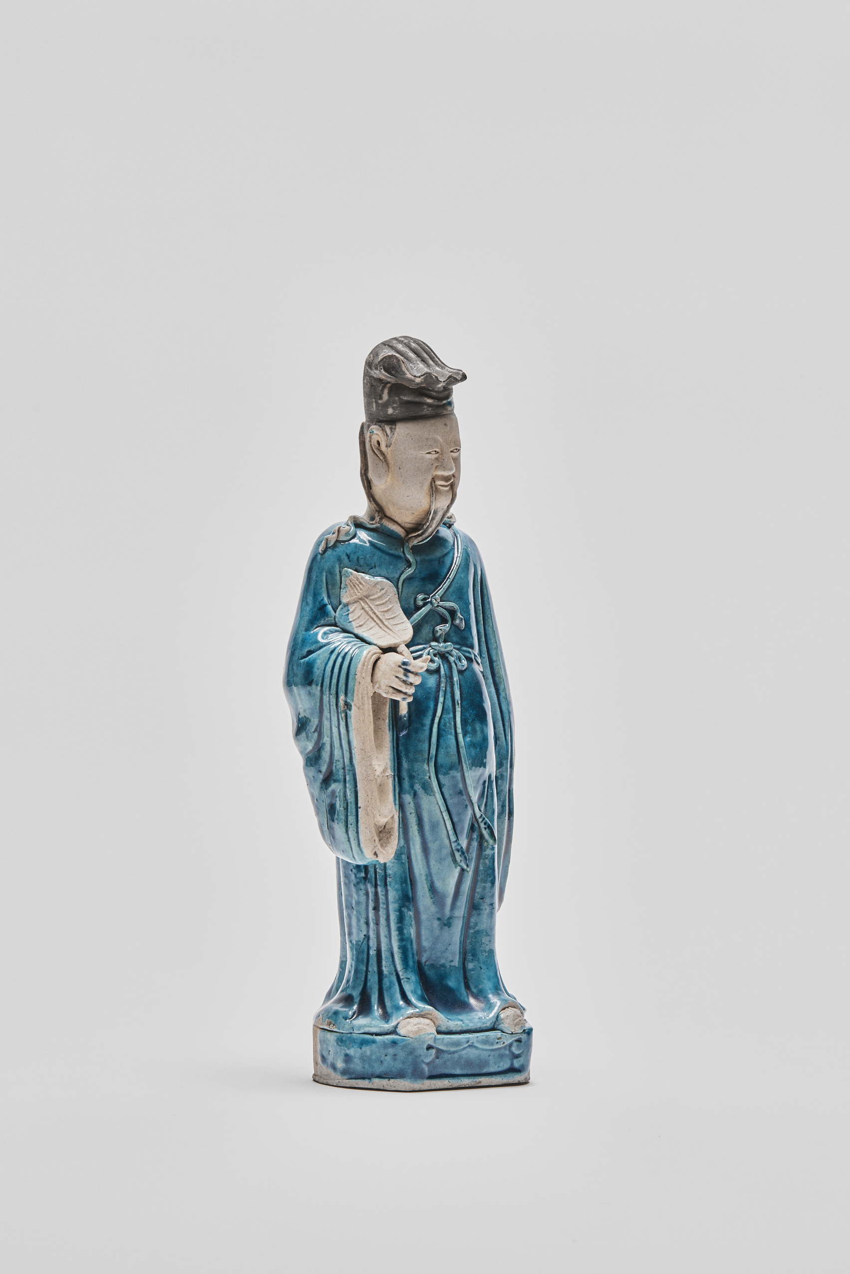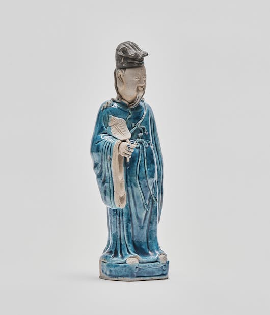 This turquoise glazed porcelain figure, represents one of the seven Daoist immortals. Lu Dongbin is often depicted as a handsome scholar.