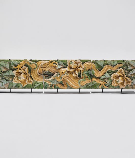 A set of three architectural tile-work panels depicting a writhing dragon amongst foliage and peony flowers. Moulded in high relief, the panels are glazed in yellow and green for a striking effect. These panels would have been part of a decorative frieze on a building.